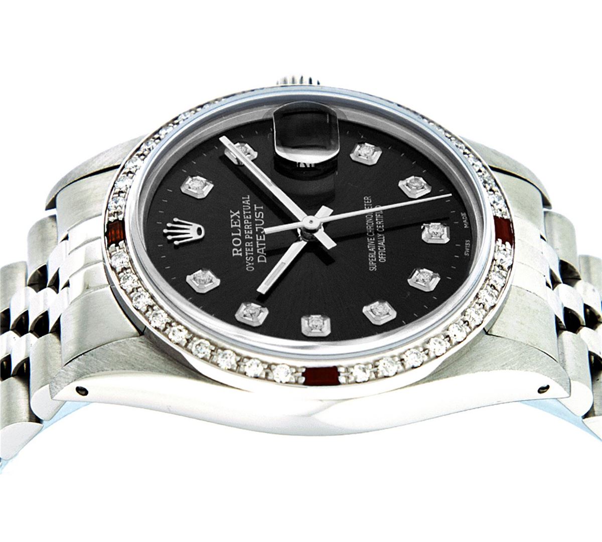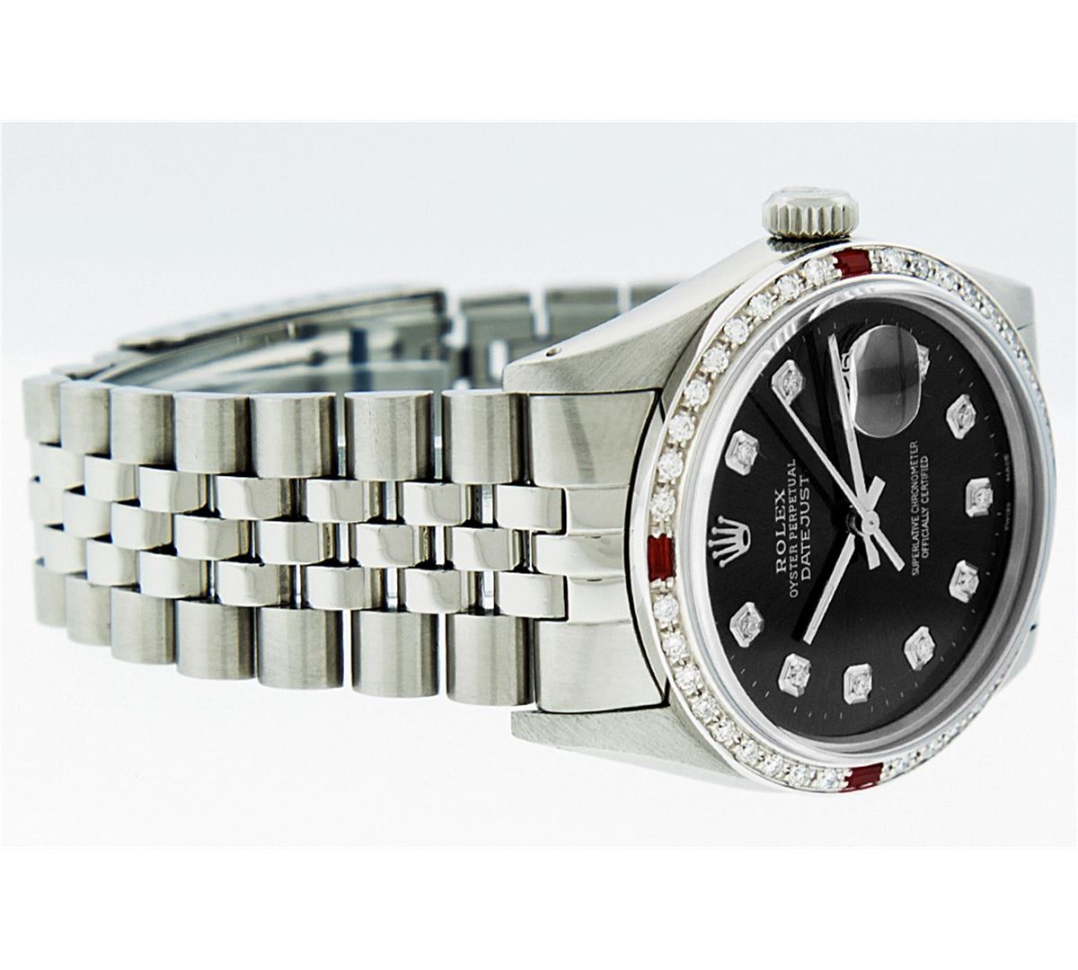 One Mens Rolex Datejust Polished Bright with Satin Finish, Serviced & Electronically Tested, Stainless Steel Case:36mm, Stainless Steel Crown, Custom Bezel: 18K White Gold Ruby Beadset Diamond Bezel, Diamond + Gem Count: 36 Diamonds + 4 Rubies. Total Weight 1.00 Carat, Clarity: Si-VS, Color: G to H. Custom Crystal: Synthetic Sapphire Cyclops Lens. Movement: Automatic Winding Movement Caliber 3035. Custom Dial: Black Diamond Dial, 10 Diamond in Dial G To H In Color, Si-VS Clarity. Date Window: 3 O'Clock Position Date Display, Quickset, Model: Datejust. Condition: G-6 Extra Fine. Bracelet: Stainless Steel Jubilee. Bright Polish & Satin Finish. 7.0 Inch Length, Adjustable. Standard Clasp, With Rolex Logo. Comes with a 6 month warranty card.
