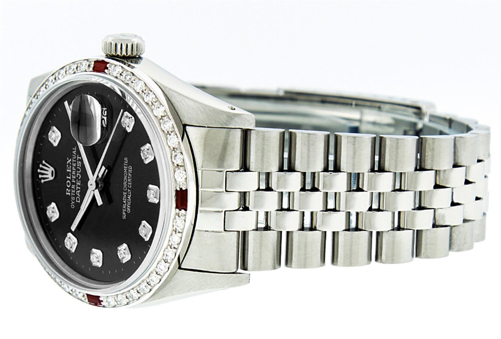 One Mens Rolex Datejust Polished Bright with Satin Finish, Serviced & Electronically Tested, Stainless Steel Case:36mm, Stainless Steel Crown, Custom Bezel: 18K White Gold Ruby Beadset Diamond Bezel, Diamond + Gem Count: 36 Diamonds + 4 Rubies. Total Weight 1.00 Carat, Clarity: Si-VS, Color: G to H. Custom Crystal: Synthetic Sapphire Cyclops Lens. Movement: Automatic Winding Movement Caliber 3035. Custom Dial: Black Diamond Dial, 10 Diamond in Dial G To H In Color, Si-VS Clarity. Date Window: 3 O'Clock Position Date Display, Quickset, Model: Datejust. Condition: G-6 Extra Fine. Bracelet: Stainless Steel Jubilee. Bright Polish & Satin Finish. 7.0 Inch Length, Adjustable. Standard Clasp, With Rolex Logo. Comes with a 6 month warranty card.