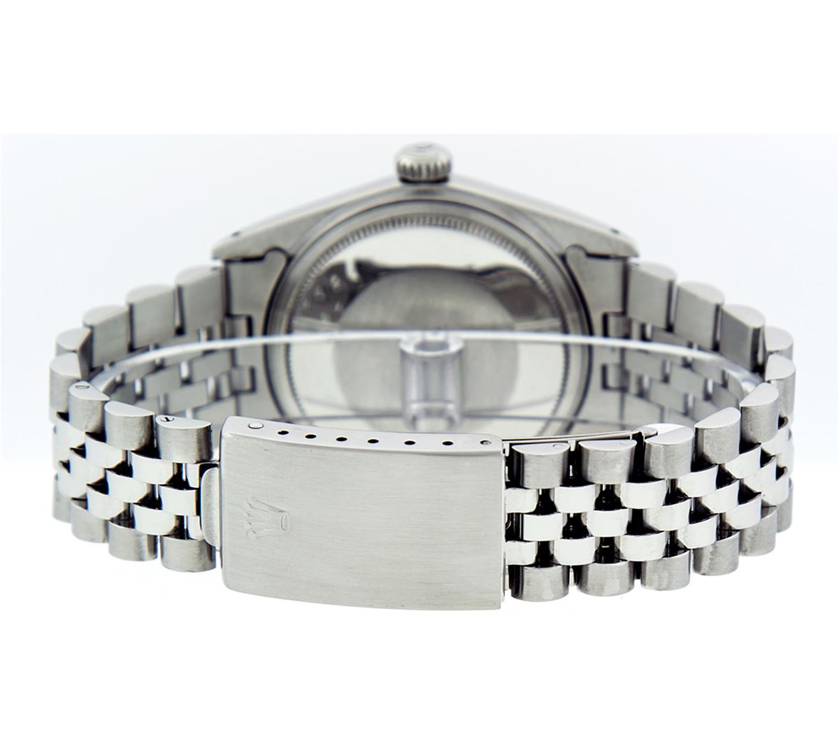 One Gents Rolex Datejust Polished, Serviced & Electronically Tested, Stainless Steel Case:36mm, Stainless Steel Crown, Bezel: 14K White Gold Fluted Bezel. Custom Crystal: Acrylic Cyclops Lens. Movement: Automatic Winding Movement Caliber 3035. Custom Dial: Black Dial With Index Hour Markers With Line Track. Date Window: 3 O'Clock Position Date Display, Quickset, Model: Datejust, Condition: G-6 Extra Fine. Bracelet: Stainless Steel Jubilee. Bright Polish & Satin Finish. 7.0 Inch Length, Adjustable. Standard Clasp, With Rolex Logo. Comes with a 6 month warranty card.