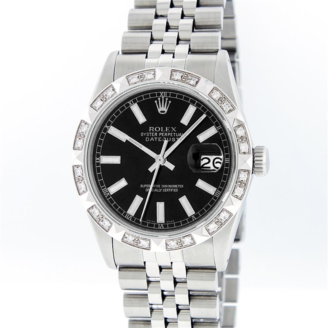 One Mens Rolex Datejust Polished Bright with Satin Finish, Serviced & Electronically Tested, Stainless Steel Case:36mm, Stainless Steel Crown, Custom Bezel:18K White Gold Pyramid Diamond Bezel, Diamond Count: 24 Diamonds Total Weight .70 Carat, Clarity: SI-VS, Color: G to H. Custom Crystal: Synthetic Sapphire Cyclops Lens. Movement: Automatic Winding Movement Caliber 3035. Custom Dial: Black Index Dial With Square Roman Track. Date Window: 3 O'Clock Position Date Display, Quickset, Model: Datejust. Condition: G-6 Extra Fine. Bracelet: Stainless Steel Jubilee. Bright Polish & Satin Finish. 7.0 Inch Length, Adjustable. Standard Clasp, With Rolex Logo. Comes with a 6 month warranty card.