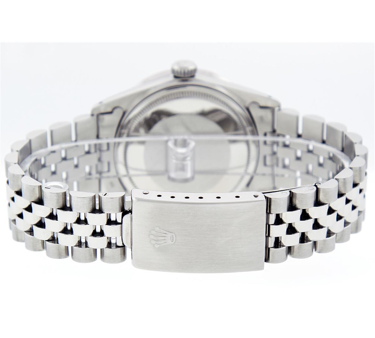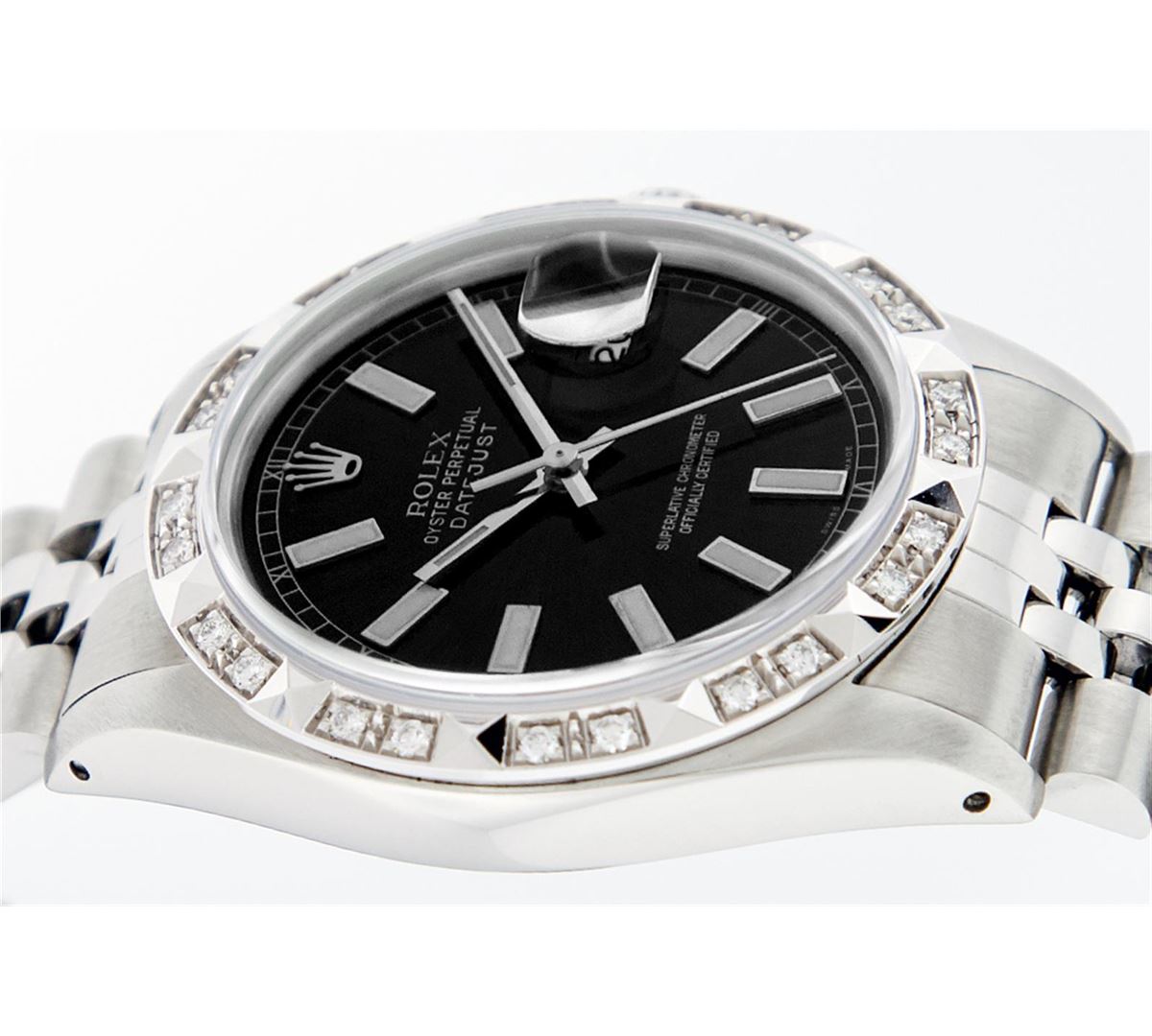 One Mens Rolex Datejust Polished Bright with Satin Finish, Serviced & Electronically Tested, Stainless Steel Case:36mm, Stainless Steel Crown, Custom Bezel:18K White Gold Pyramid Diamond Bezel, Diamond Count: 24 Diamonds Total Weight .70 Carat, Clarity: SI-VS, Color: G to H. Custom Crystal: Synthetic Sapphire Cyclops Lens. Movement: Automatic Winding Movement Caliber 3035. Custom Dial: Black Index Dial With Square Roman Track. Date Window: 3 O'Clock Position Date Display, Quickset, Model: Datejust. Condition: G-6 Extra Fine. Bracelet: Stainless Steel Jubilee. Bright Polish & Satin Finish. 7.0 Inch Length, Adjustable. Standard Clasp, With Rolex Logo. Comes with a 6 month warranty card.