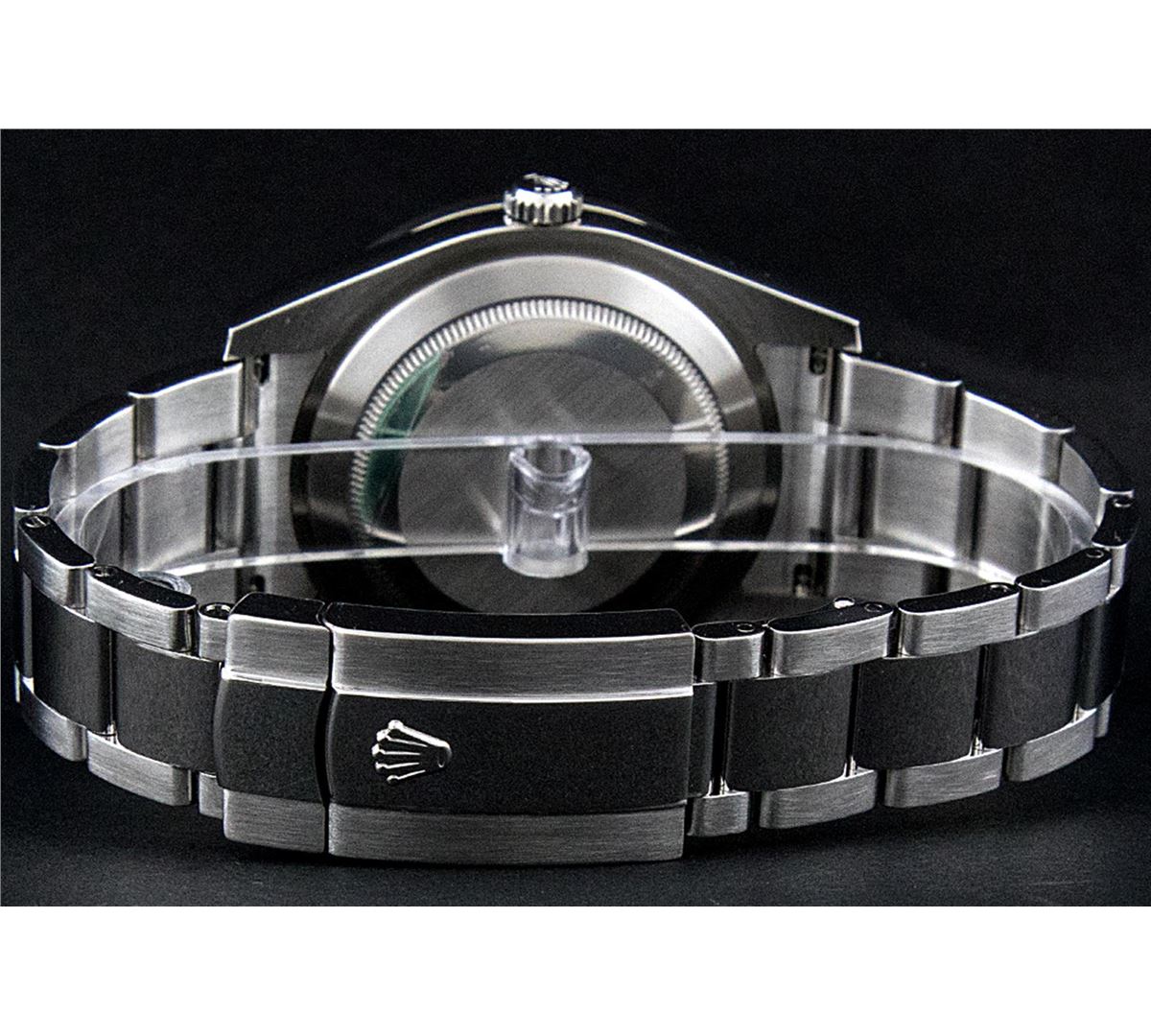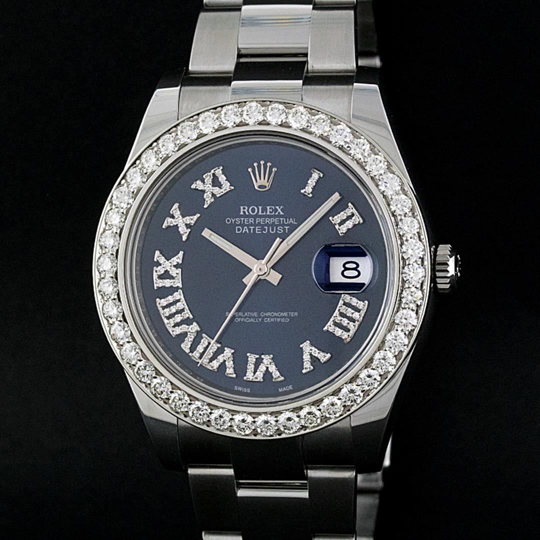 One Mens Rolex Datejust 2 Polished Bright with Satin Finish, Serviced & Electronically Tested, Stainless Steel Case:41mm, Stainless Steel Crown, Custom Bezel: Stainless Steel Beadset Diamond Bezel, Diamond Count: 42 Diamonds. Total Weight 3.5 Carat, Clarity: Si-VS, Color: G to H. Crystal: Synthetic Sapphire Cyclops Lens. Movement: Automatic Winding Movement Caliber 3136. Custom Dial: Black Diamond Roman Dial, Color: G To H, Clarity: SI-VS. Date Window: 3 O'Clock Position Date Display, Quickset, Model: 116300 Datejust 2. Condition: G-6 Extra Fine. Bracelet: Stainless Steel Oyster Band. Bright Polish & Satin Finish. 7.5 Inch Length, Adjustable. Standard Clasp, With Rolex Logo. Comes with a 6 month warranty card.