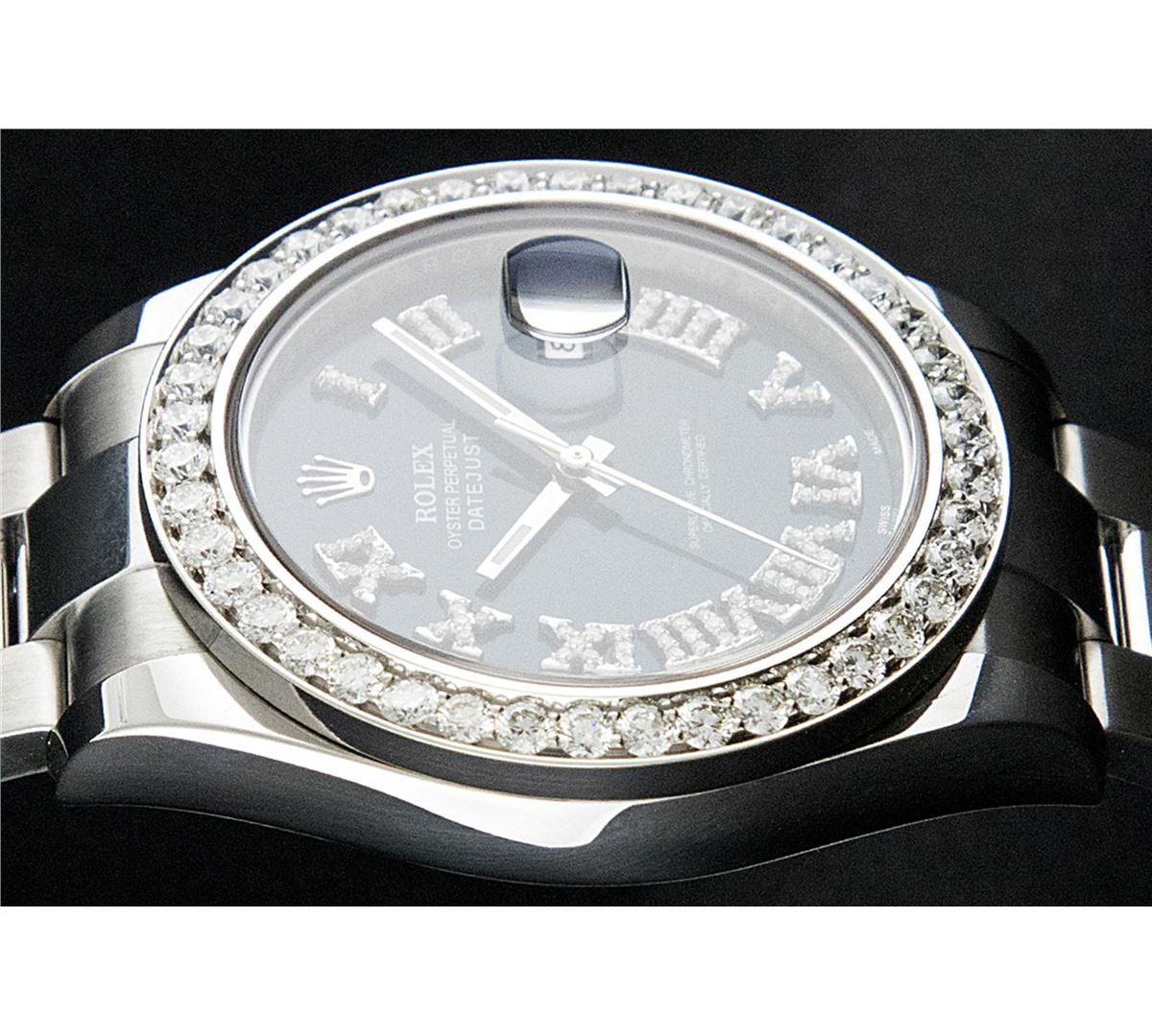 One Mens Rolex Datejust 2 Polished Bright with Satin Finish, Serviced & Electronically Tested, Stainless Steel Case:41mm, Stainless Steel Crown, Custom Bezel: Stainless Steel Beadset Diamond Bezel, Diamond Count: 42 Diamonds. Total Weight 3.5 Carat, Clarity: Si-VS, Color: G to H. Crystal: Synthetic Sapphire Cyclops Lens. Movement: Automatic Winding Movement Caliber 3136. Custom Dial: Black Diamond Roman Dial, Color: G To H, Clarity: SI-VS. Date Window: 3 O'Clock Position Date Display, Quickset, Model: 116300 Datejust 2. Condition: G-6 Extra Fine. Bracelet: Stainless Steel Oyster Band. Bright Polish & Satin Finish. 7.5 Inch Length, Adjustable. Standard Clasp, With Rolex Logo. Comes with a 6 month warranty card.
