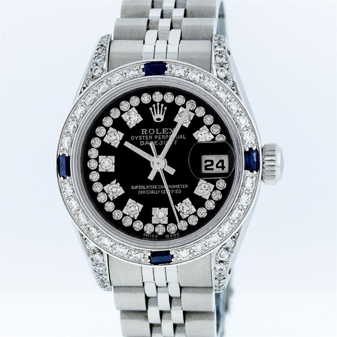 One Ladies Rolex Datejust Polished Bright with Satin Finish, Serviced & Electronically Tested, Stainless Steel Case:26mm, Stainless Steel Crown, Diamond Lugs: 16 Diamonds On Lugs, Clarity: SI-VS, Color: G to H. Custom Bezel: 18K White Gold Sapphire Beadset Bezel, Diamond Count: 28 Diamonds + 4 Sapphires, Total Weight 1.00 Carat, Clarity: SI-VS, Color: G to H. Custom Crystal: Synthetic Sapphire Cyclops Lens. Movement: Automatic Winding Movement Caliber 2030. Custom Dial: Refinished Black With String Diamond Dial, 43 Diamonds in Dial G To H In Color, Clarity: VVS. Date Window: 3 O'Clock Position Date Display, Model: Datejust Condition: G-6 Extra Fine. Bracelet: Stainless Steel Jubilee. Bright Polish & Satin Finish. 5.5 Inch Length, Adjustable. Standard Clasp, With Rolex Logo. Comes with a 6 month warranty card.