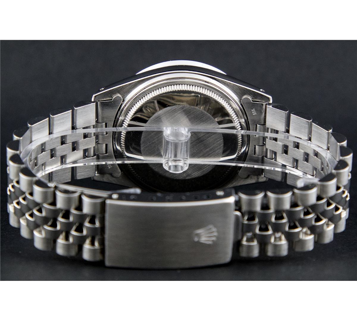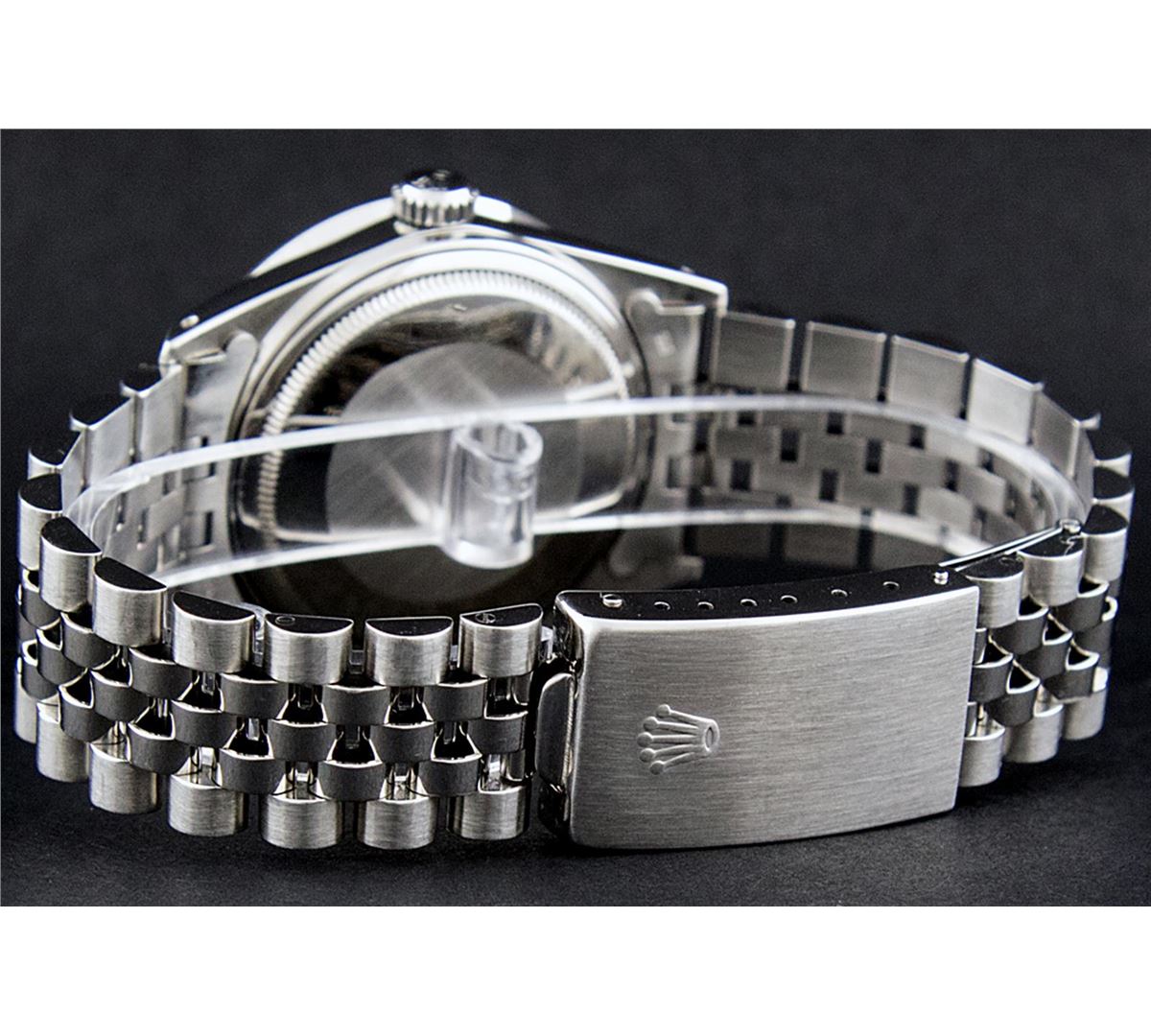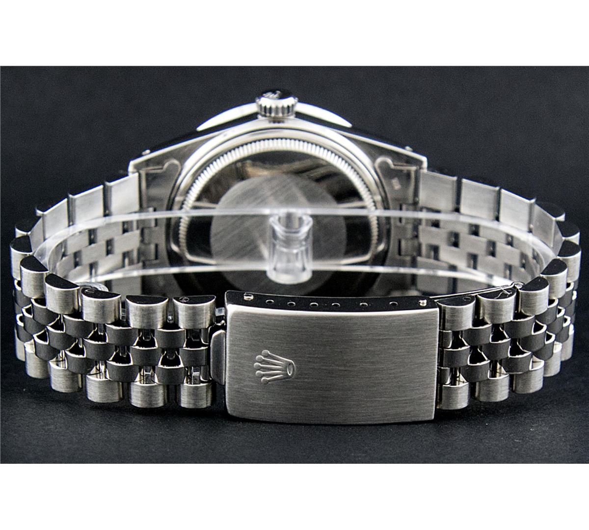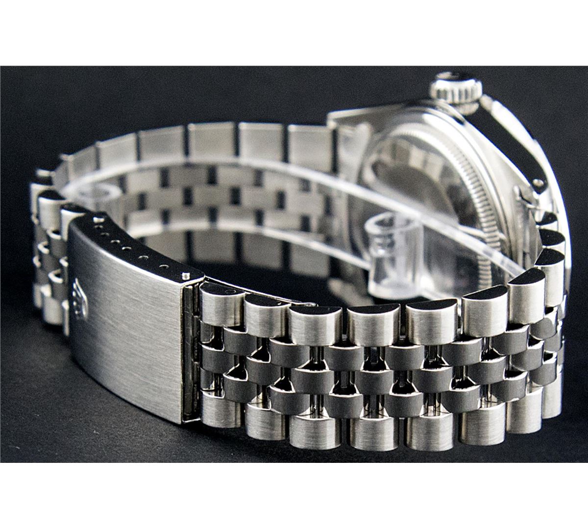 One Mens Rolex Datejust Polished Bright with Satin Finish, Serviced & Electronically Tested, Stainless Steel Case:36mm, Stainless Steel Crown, Custom Bezel: 18K White Gold Pyramid Diamond Bezel, Diamond Count: 24 Diamonds Total Weight .70 Carat, Clarity: SI-VS, Color: G to H. Custom Crystal: Synthetic Sapphire Cyclops Lens. Movement: Automatic Winding Movement Caliber 3035. Custom Dial: Blue Index Dial. Date Window: 3 O'Clock Position Date Display, Quickset, Model: 16014 Condition: G-6 Extra Fine. Bracelet: Stainless Steel Jubilee. Bright Polish & Satin Finish. 7.0 Inch Length, Adjustable. Standard Clasp, With Rolex Logo.