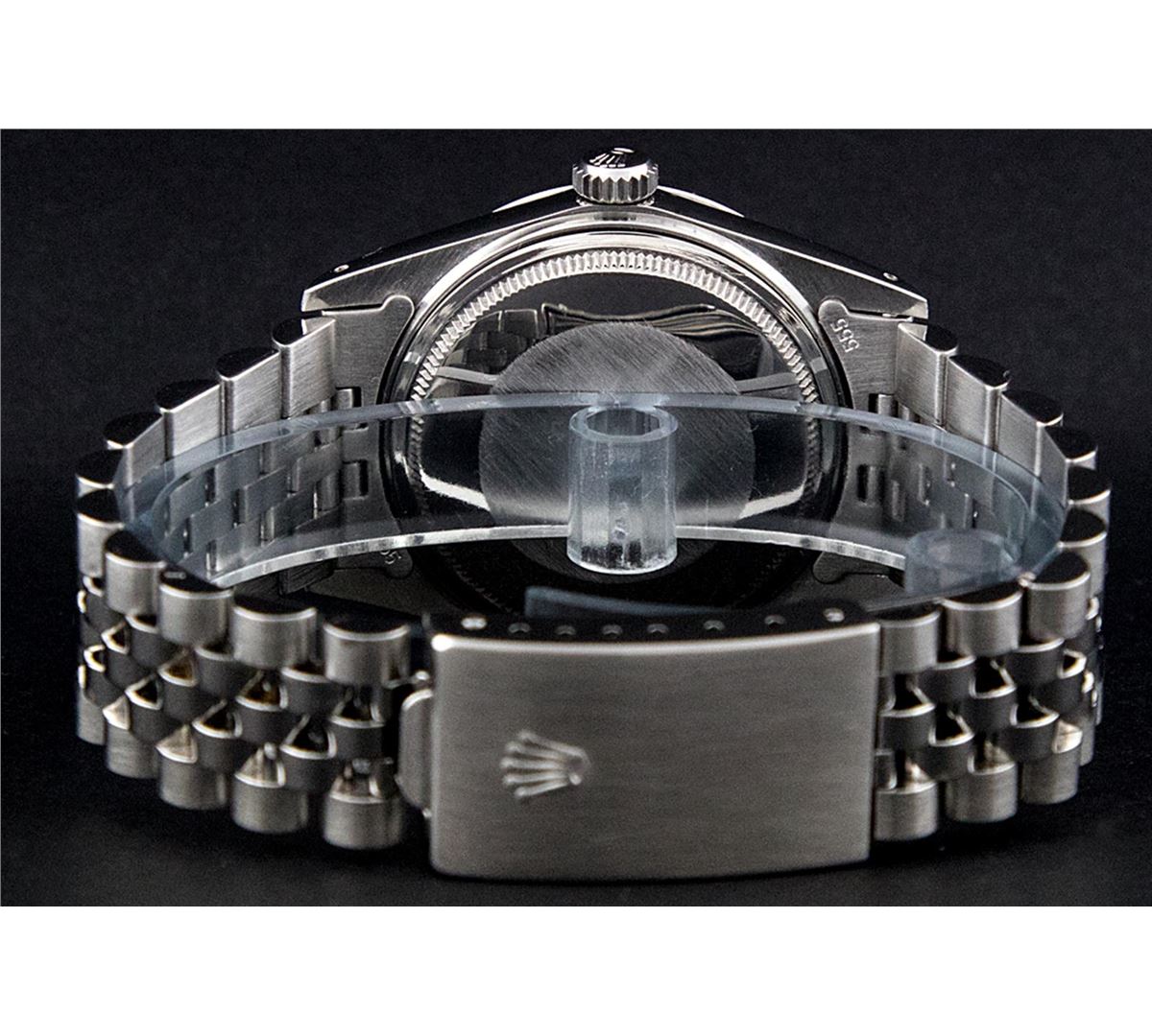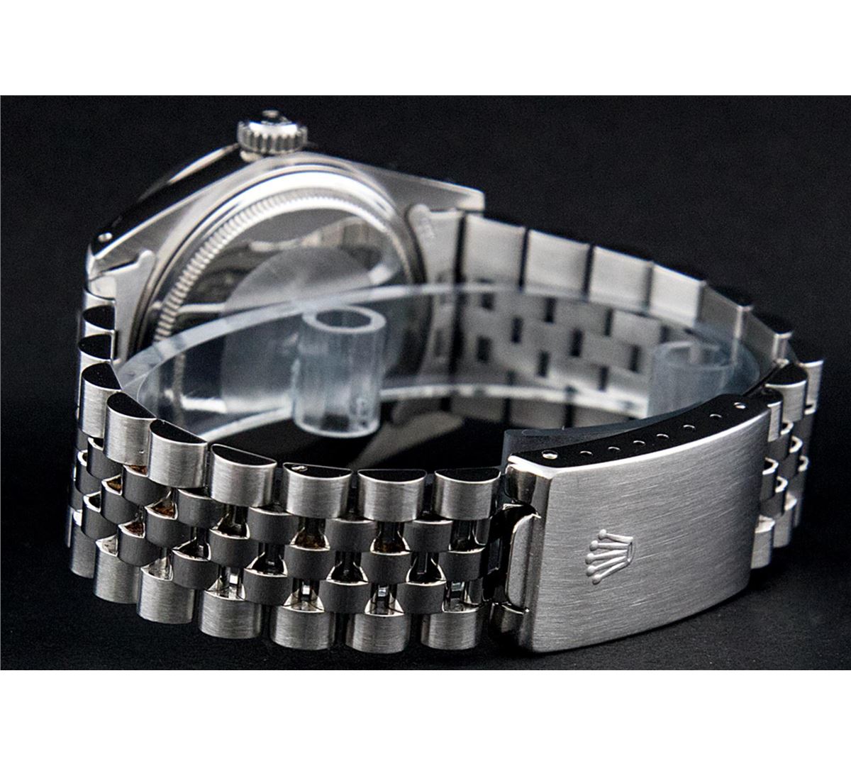 One Gents Rolex Datejust Polished, Serviced & Electronically Tested, Stainless Steel Case:36mm, Stainless Steel Crown, Custom Bezel: 18K White Gold Sapphire Beadset Diamond Bezel, Diamond + Gem Count: 36 Diamonds + 4 Sapphires Total Weight 1.00 Carat, Clarity: SI-VS, Color: G to H. Custom Crystal: Synthetic Sapphire Cyclops Lens. Movement: Automatic Winding Movement Caliber 3035. Custom Dial: Blue Diamond Dial With Small Track, Diamond Count: 10 Diamond Dial G To H In Color, Clarity: SI-VS. Date Window: 3 O'Clock Position Date Display, Quickset, Model: 16014 Condition: G-6 Extra Fine. Bracelet: Stainless Steel Jubilee. Bright Polish & Satin Finish. 7.0 Inch Length, Adjustable. Standard Clasp, With Rolex Logo.