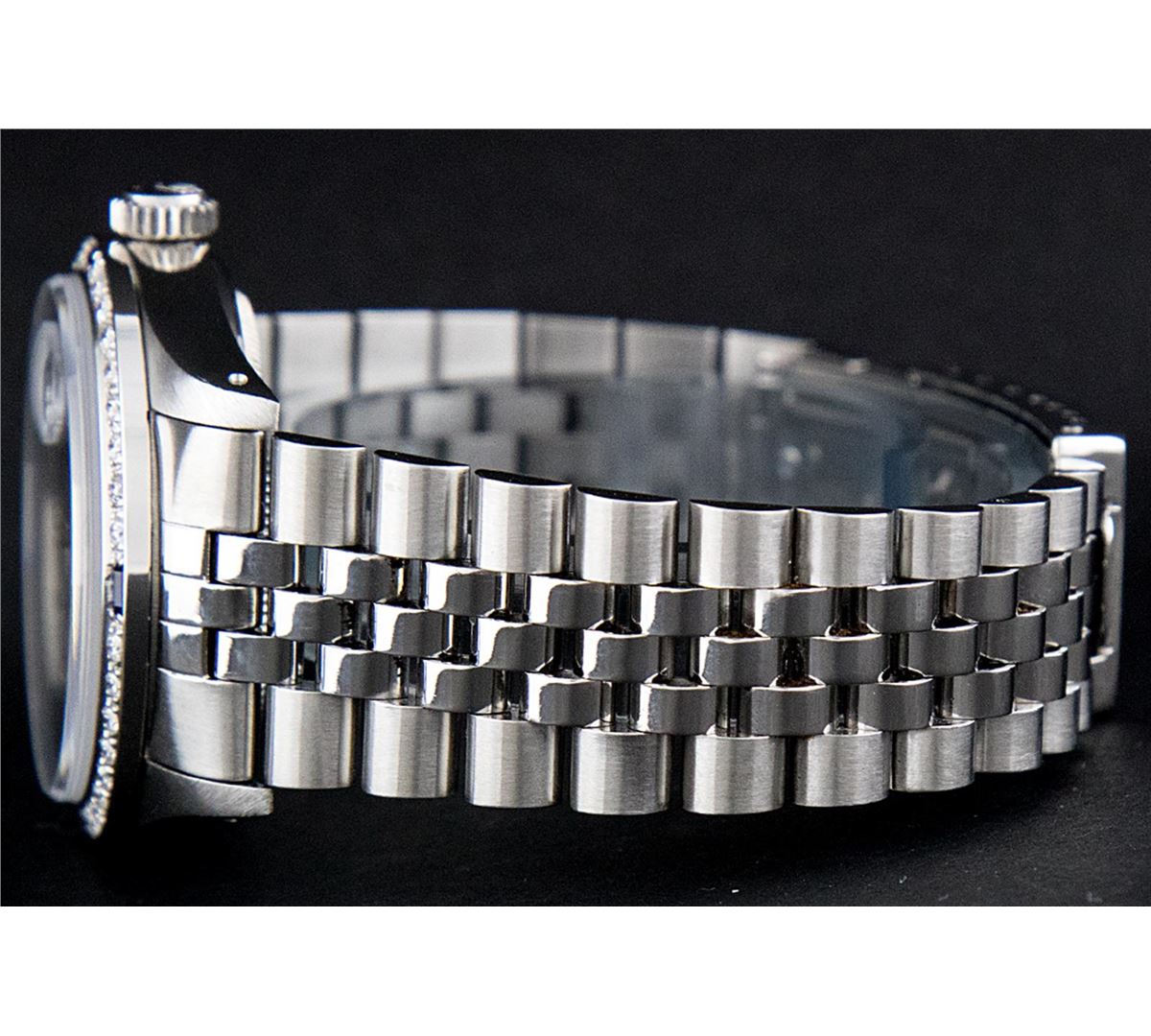 One Gents Rolex Datejust Polished, Serviced & Electronically Tested, Stainless Steel Case:36mm, Stainless Steel Crown, Custom Bezel: 18K White Gold Sapphire Beadset Diamond Bezel, Diamond + Gem Count: 36 Diamonds + 4 Sapphires Total Weight 1.00 Carat, Clarity: SI-VS, Color: G to H. Custom Crystal: Synthetic Sapphire Cyclops Lens. Movement: Automatic Winding Movement Caliber 3035. Custom Dial: Blue Diamond Dial With Small Track, Diamond Count: 10 Diamond Dial G To H In Color, Clarity: SI-VS. Date Window: 3 O'Clock Position Date Display, Quickset, Model: 16014 Condition: G-6 Extra Fine. Bracelet: Stainless Steel Jubilee. Bright Polish & Satin Finish. 7.0 Inch Length, Adjustable. Standard Clasp, With Rolex Logo.