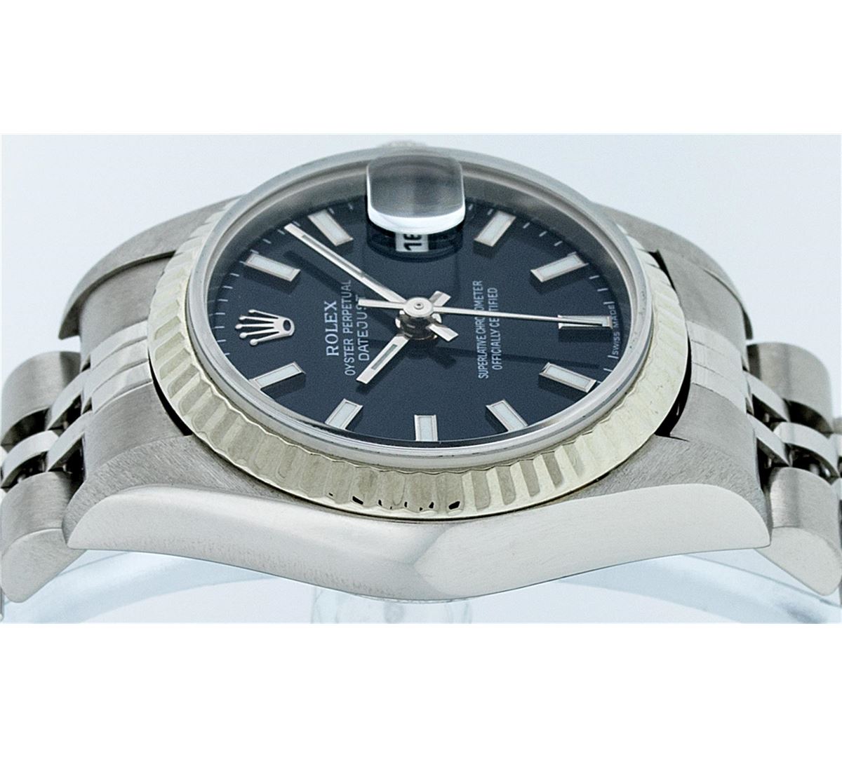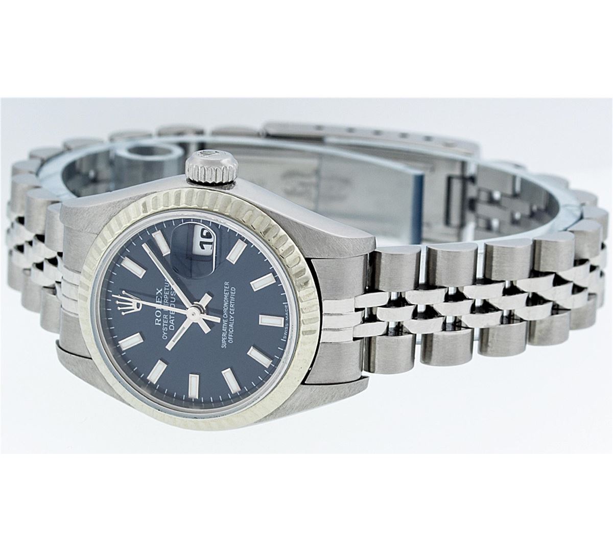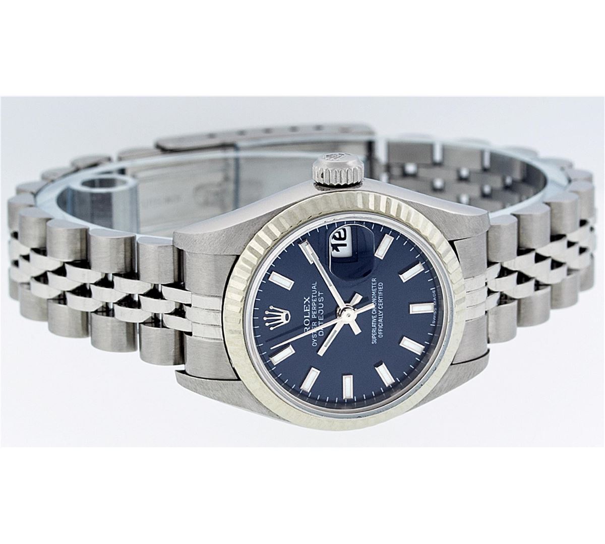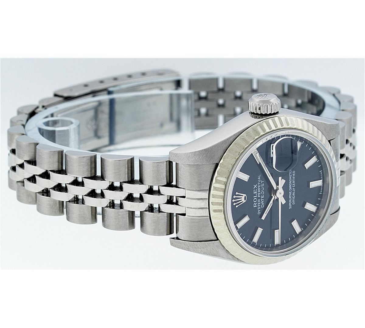 One Ladies Rolex Datejust Polished Bright with Satin Finish, Serviced & Electronically Tested, Stainless Steel Case:26mm, Stainless Steel Crown, Bezel: 18K White Gold Fluted Bezel. Custom Crystal: Synthetic Sapphire Cyclops Lens. Movement: Automatic Winding Movement Caliber 2235. Dial: Blue Index Dial With Line Track. Date Window: 3 O'Clock Position Date Display, Model: No Hole Datejust 79174. Condition: G-6 Extra Fine. Bracelet: Stainless Steel Jubilee Band. Bright Polish & Satin Finish. 6.0 Inch Length, Adjustable. Standard Clasp, With Rolex Logo.