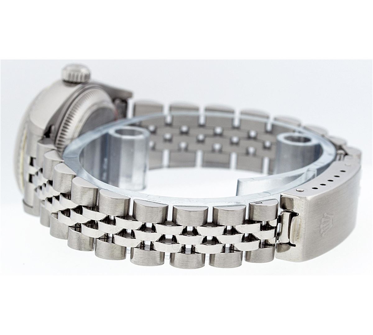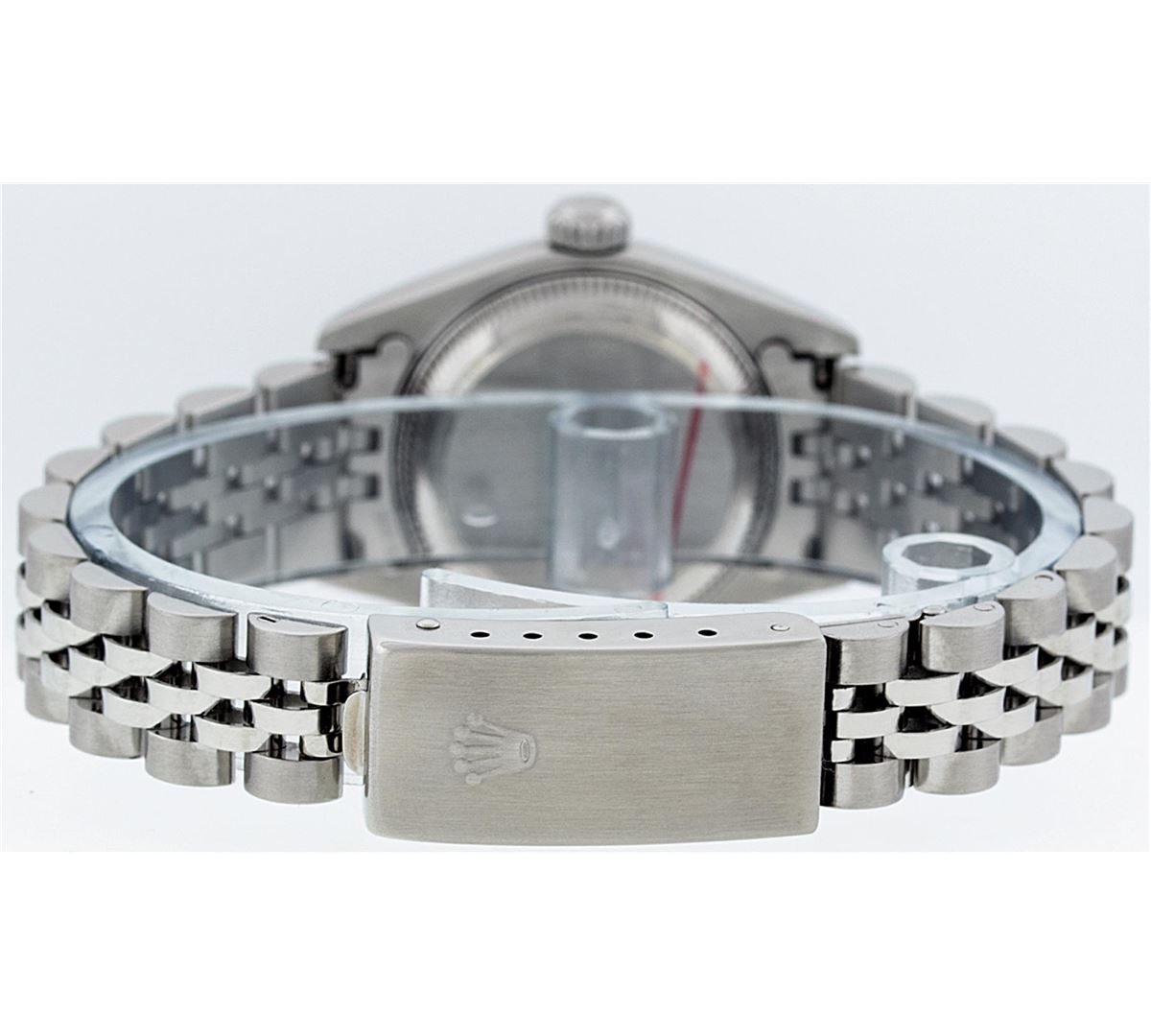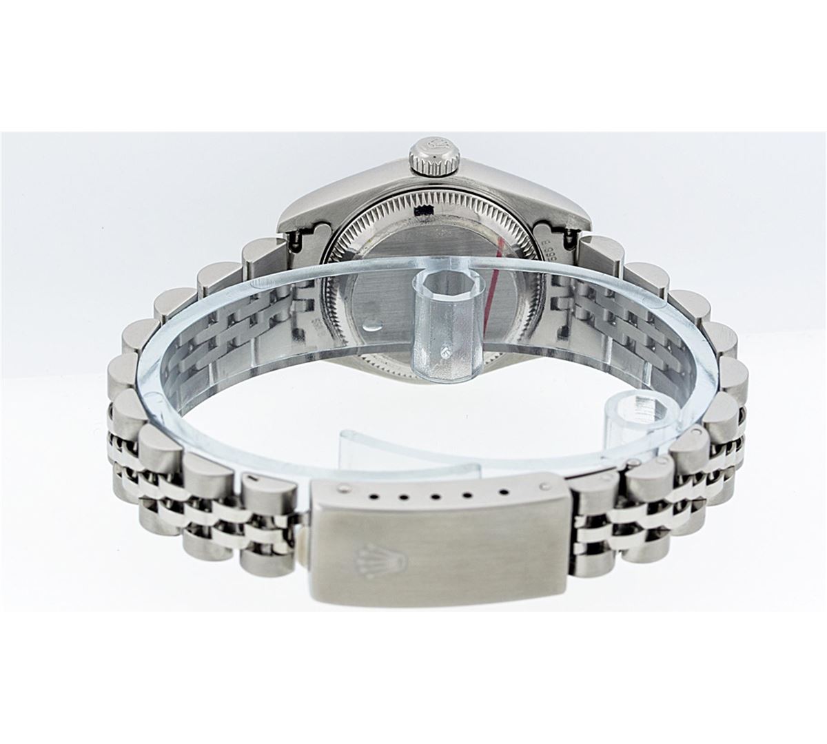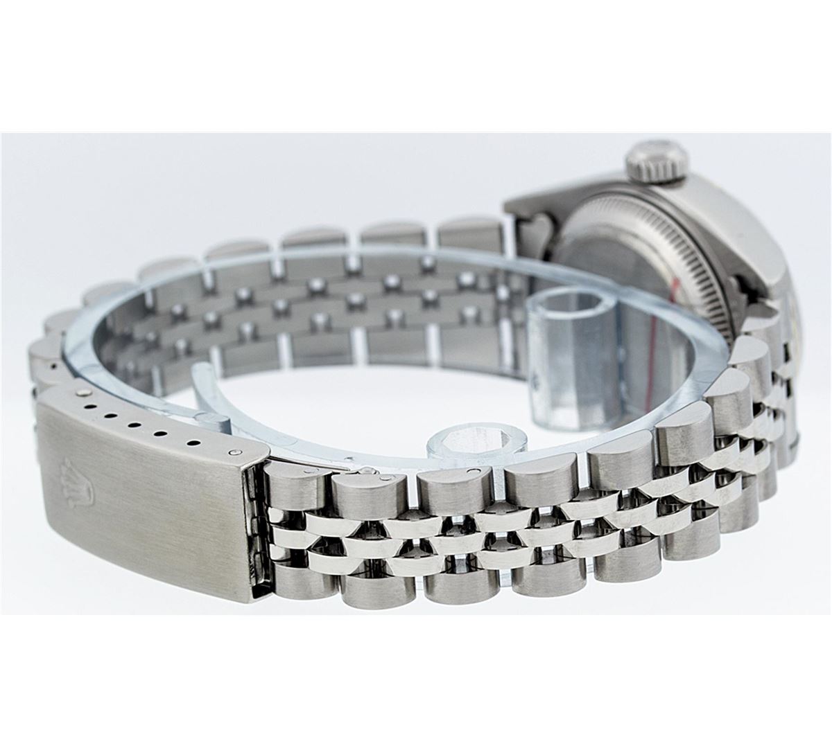 One Ladies Rolex Datejust Polished Bright with Satin Finish, Serviced & Electronically Tested, Stainless Steel Case:26mm, Stainless Steel Crown, Bezel: 18K White Gold Fluted Bezel. Custom Crystal: Synthetic Sapphire Cyclops Lens. Movement: Automatic Winding Movement Caliber 2235. Dial: Blue Index Dial With Line Track. Date Window: 3 O'Clock Position Date Display, Model: No Hole Datejust 79174. Condition: G-6 Extra Fine. Bracelet: Stainless Steel Jubilee Band. Bright Polish & Satin Finish. 6.0 Inch Length, Adjustable. Standard Clasp, With Rolex Logo.