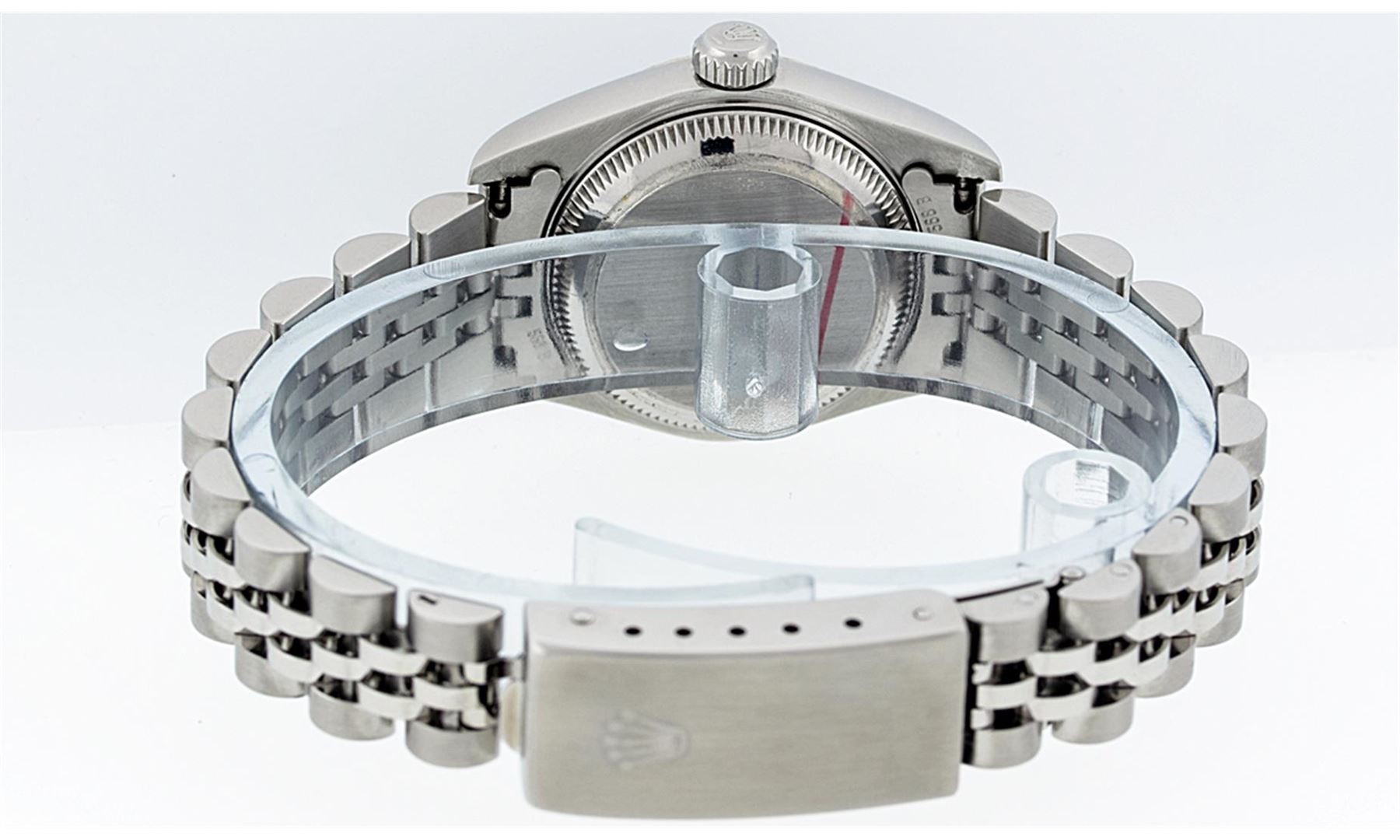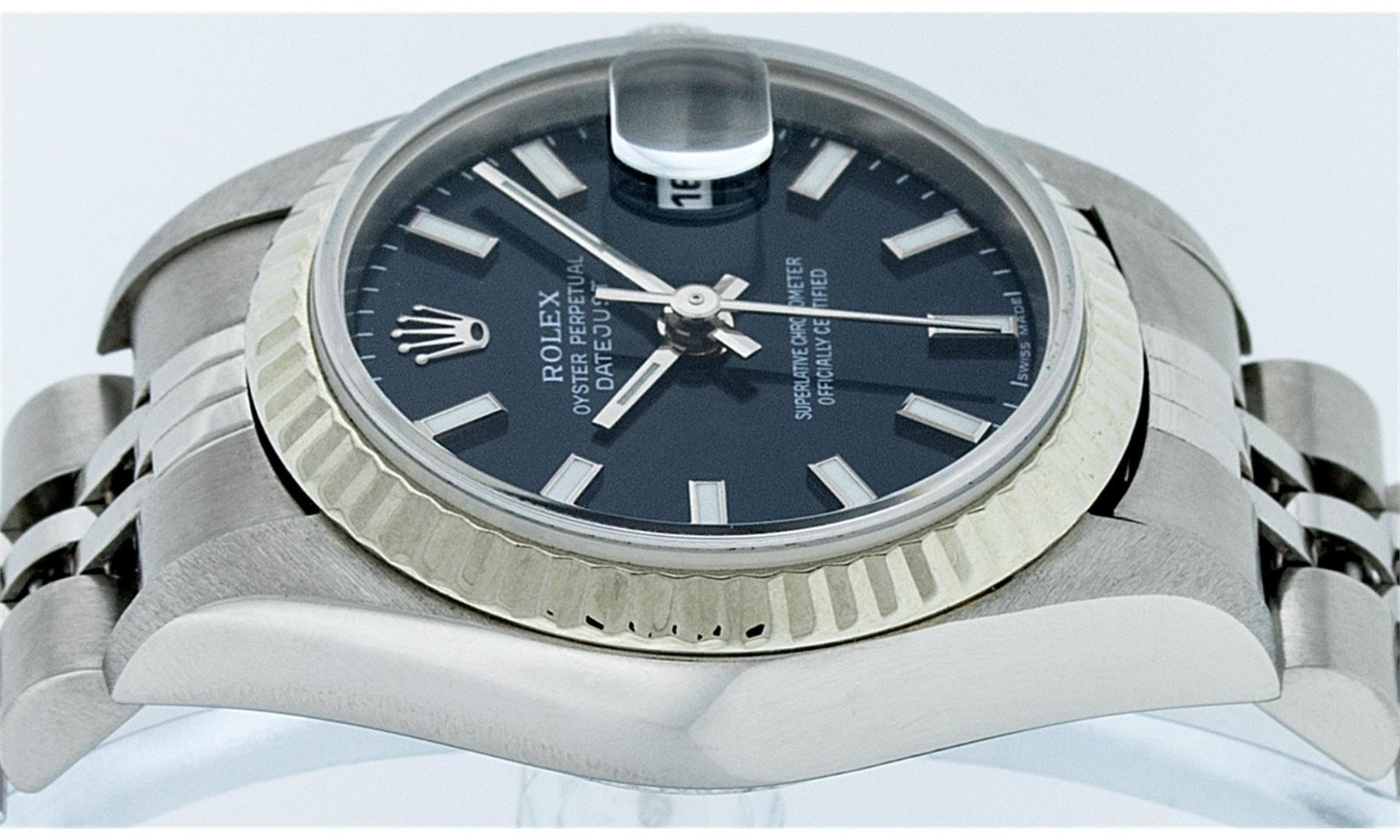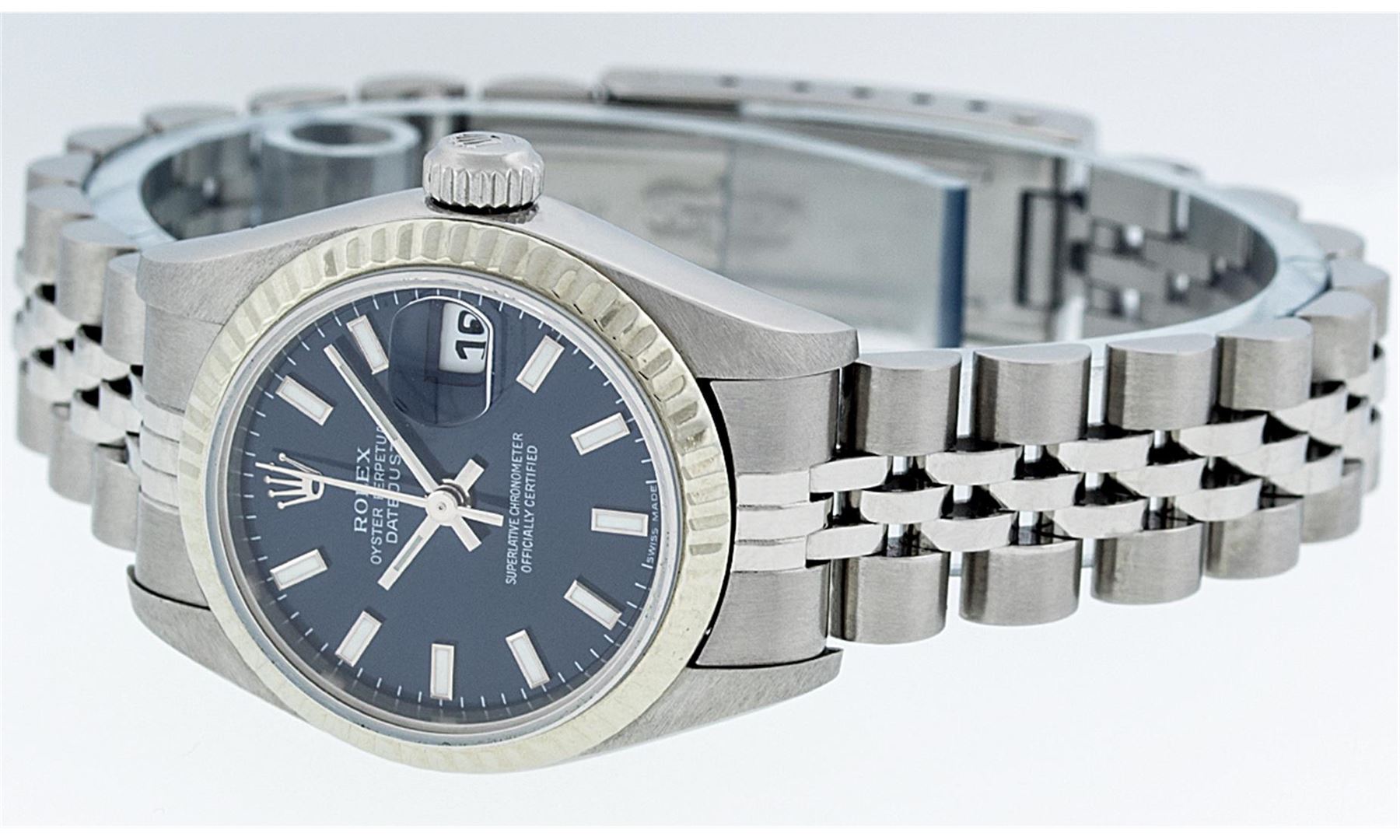 One Ladies Rolex Datejust Polished Bright with Satin Finish, Serviced & Electronically Tested, Stainless Steel Case:26mm, Stainless Steel Crown, Bezel: 18K White Gold Fluted Bezel. Custom Crystal: Synthetic Sapphire Cyclops Lens. Movement: Automatic Winding Movement Caliber 2235. Dial: Blue Index Dial With Line Track. Date Window: 3 O'Clock Position Date Display, Model: No Hole Datejust 79174. Condition: G-6 Extra Fine. Bracelet: Stainless Steel Jubilee Band. Bright Polish & Satin Finish. 6.0 Inch Length, Adjustable. Standard Clasp, With Rolex Logo.