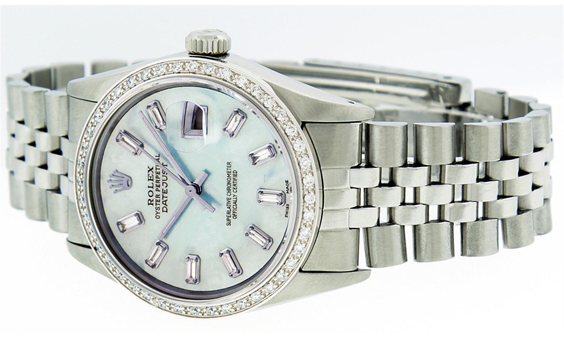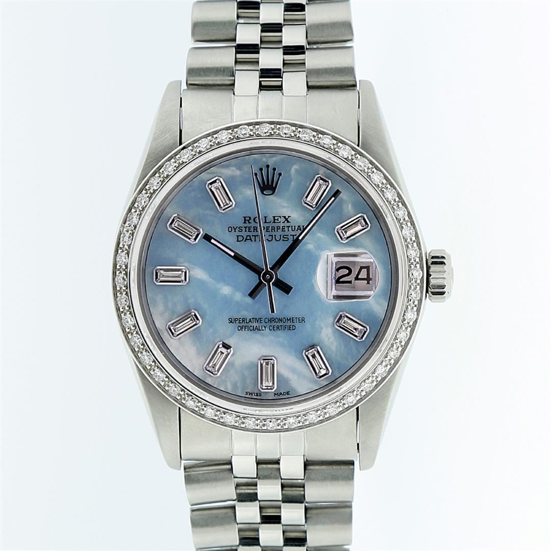 One Gents Rolex Datejust Polished, Serviced & Electronically Tested, Stainless Steel Case:36mm, Stainless Steel Crown, Custom Bezel: 18K White Gold Beadset Diamond Bezel, Diamond Count: 44 Diamonds, Total Weight 1.00 Carat, Clarity: SI-VS, Color: G to H. Custom Crystal: Synthetic Sapphire Cyclops Lens. Movement: Automatic Winding Movement Caliber 3035. Custom Dial: Blue MOP Baguette Diamond Hour Markers, Diamond Count: 10 Diamond Baguette. G To H In Color, Clarity: SI-VS. Date Window: 3 O'Clock Position Date Display, Quickset, Model: Datejust. Condition: G-6 Extra Fine. Bracelet: Stainless Steel Jubilee. Bright Polish & Satin Finish. 7.0 Inch Length, Adjustable. Standard Clasp, With Rolex Logo. Comes with 6 month warranty.
