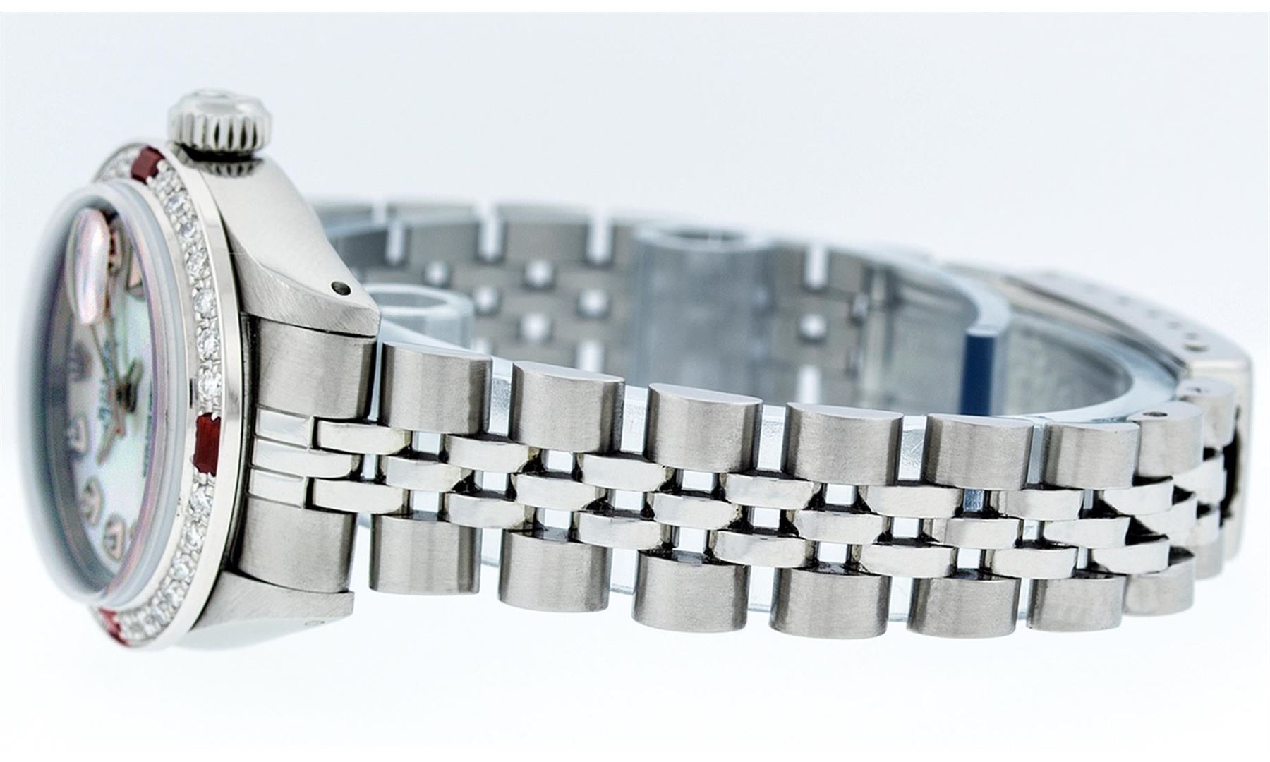 Ladies Rolex Datejust Polished Bright with Satin Finish, Serviced & Electronically Tested, Stainless Steel Case:26mm, Stainless Steel Crown, Custom Bezel: 18K White Gold Ruby Beadset Diamond Bezel, Diamond + Gem Count: 28 Diamonds + 4 Ruby. Total Weight .70 Carat, Clarity: SI-VS, Color: G to H. Custom Crystal: Synthetic Sapphire Cyclops Lens. Movement: Automatic Winding Movement Caliber 2030. Custom Dial: Refinished Blue MOP With Diamond Hour Markers. Diamond Count: 10 Diamonds, Color: G To H, Clarity: SI-VS. Date Window: 3 O'Clock Position Date Display, Model: Datejust. Condition: G-6 Extra Fine. Bracelet: Stainless Steel Jubilee. Bright Polish & Satin Finish. 6.0 Inch Length, Adjustable. Standard Clasp, With Rolex Logo. Comes with 6 month warranty.
