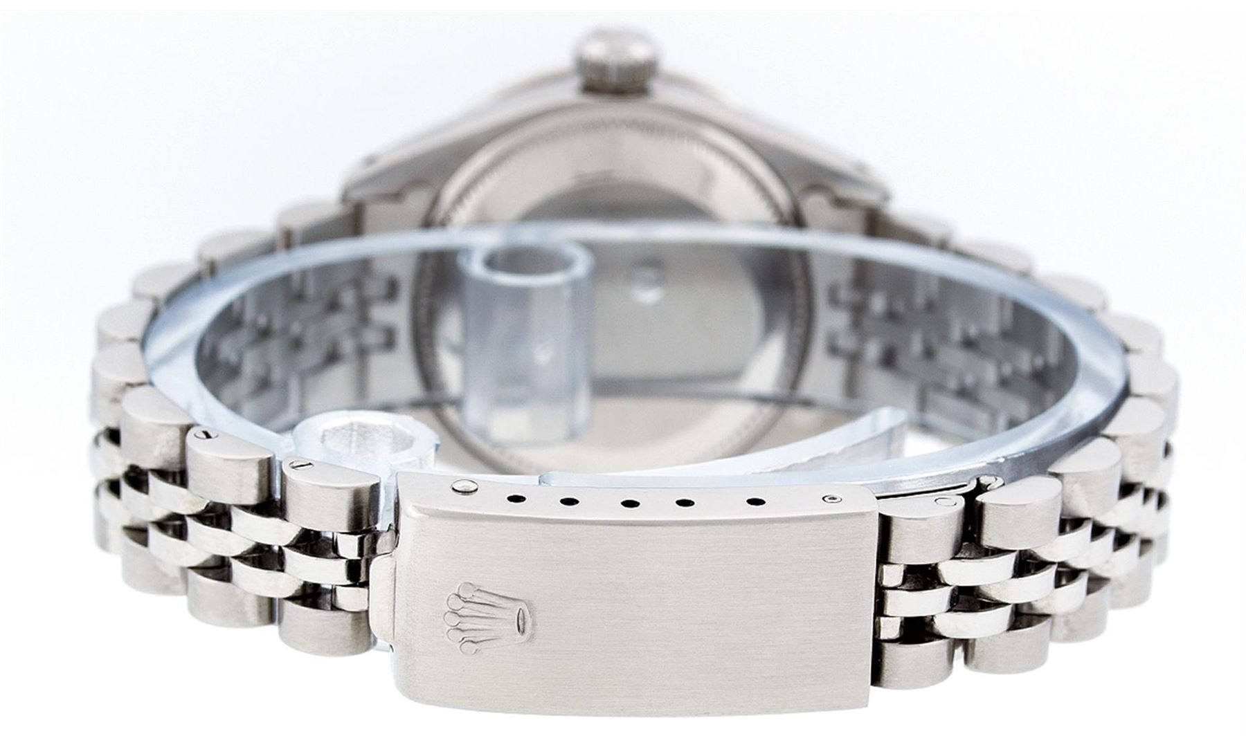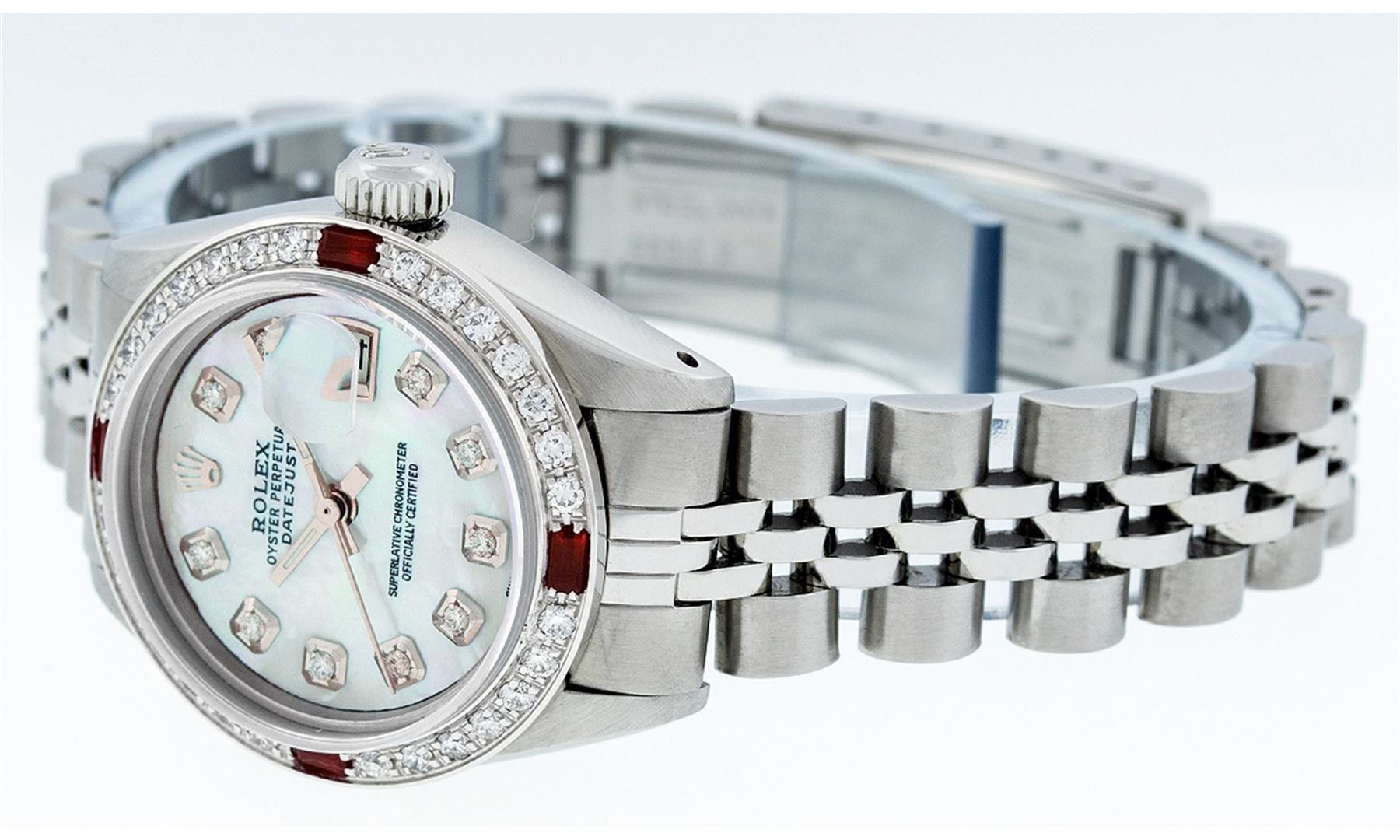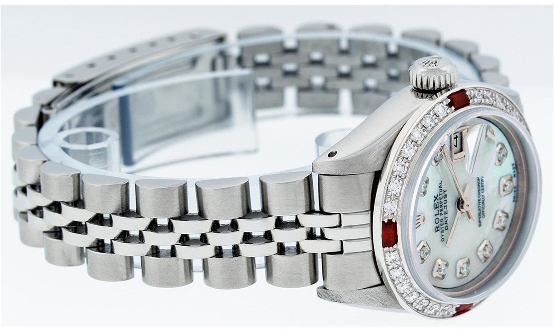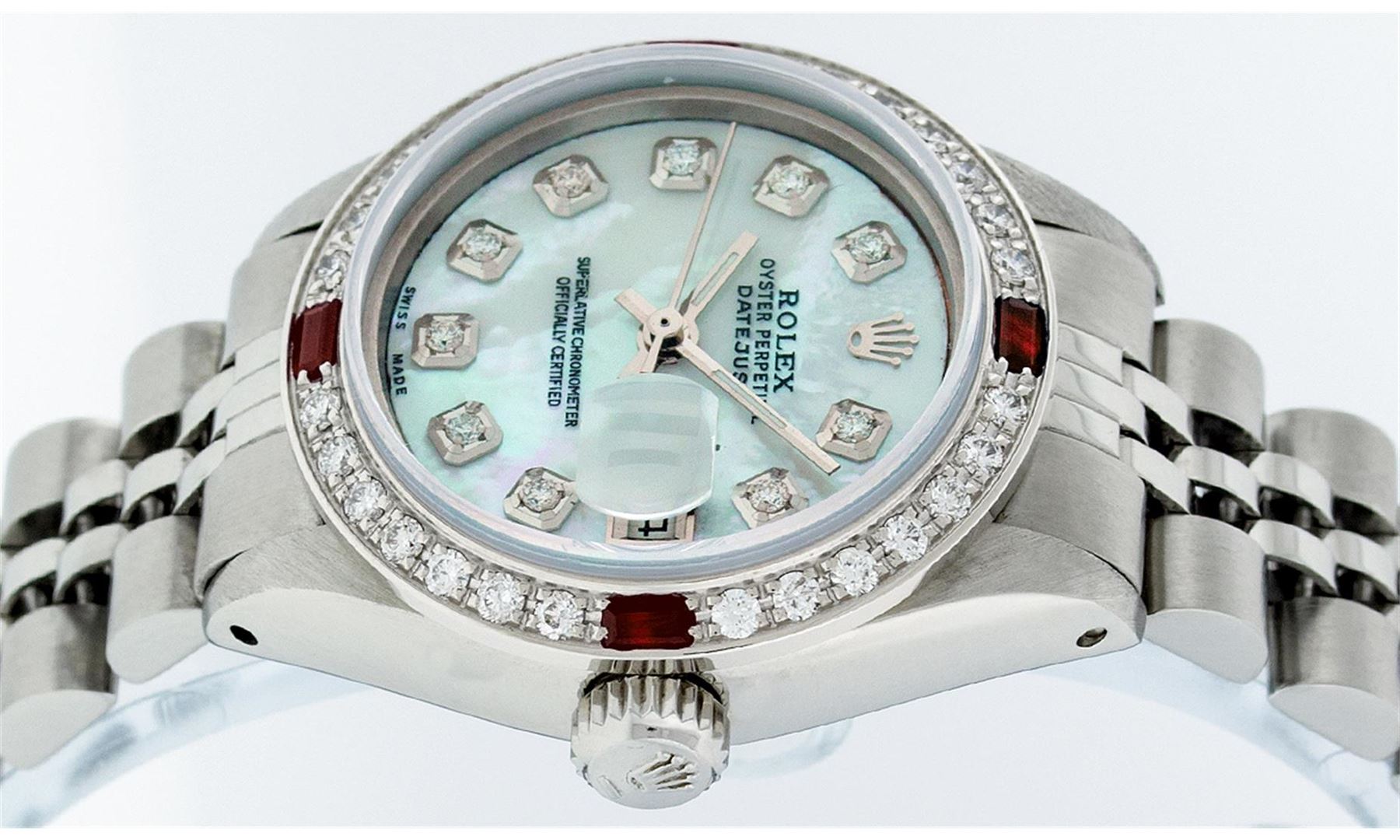 Ladies Rolex Datejust Polished Bright with Satin Finish, Serviced & Electronically Tested, Stainless Steel Case:26mm, Stainless Steel Crown, Custom Bezel: 18K White Gold Ruby Beadset Diamond Bezel, Diamond + Gem Count: 28 Diamonds + 4 Ruby. Total Weight .70 Carat, Clarity: SI-VS, Color: G to H. Custom Crystal: Synthetic Sapphire Cyclops Lens. Movement: Automatic Winding Movement Caliber 2030. Custom Dial: Refinished Blue MOP With Diamond Hour Markers. Diamond Count: 10 Diamonds, Color: G To H, Clarity: SI-VS. Date Window: 3 O'Clock Position Date Display, Model: Datejust. Condition: G-6 Extra Fine. Bracelet: Stainless Steel Jubilee. Bright Polish & Satin Finish. 6.0 Inch Length, Adjustable. Standard Clasp, With Rolex Logo. Comes with 6 month warranty.