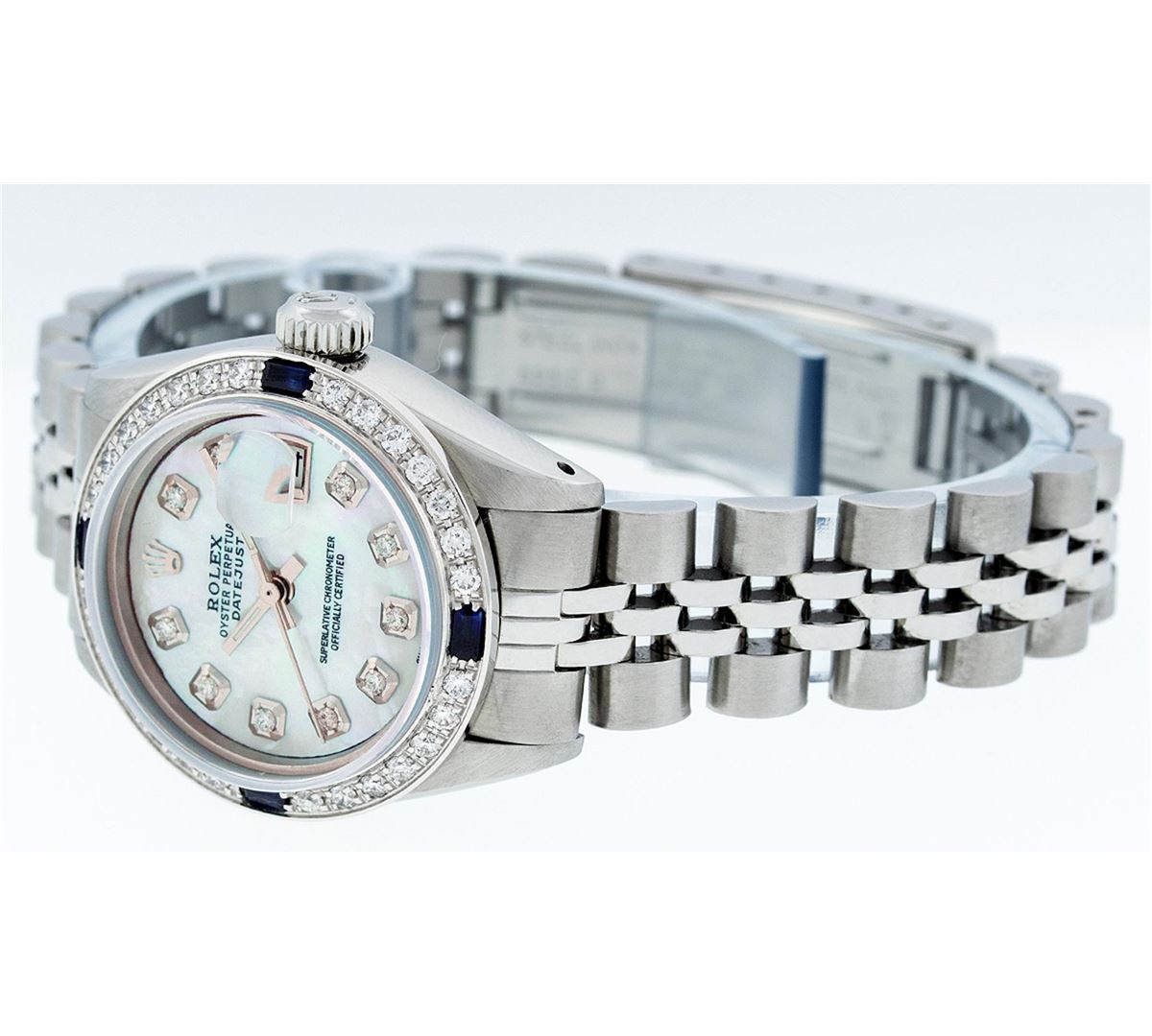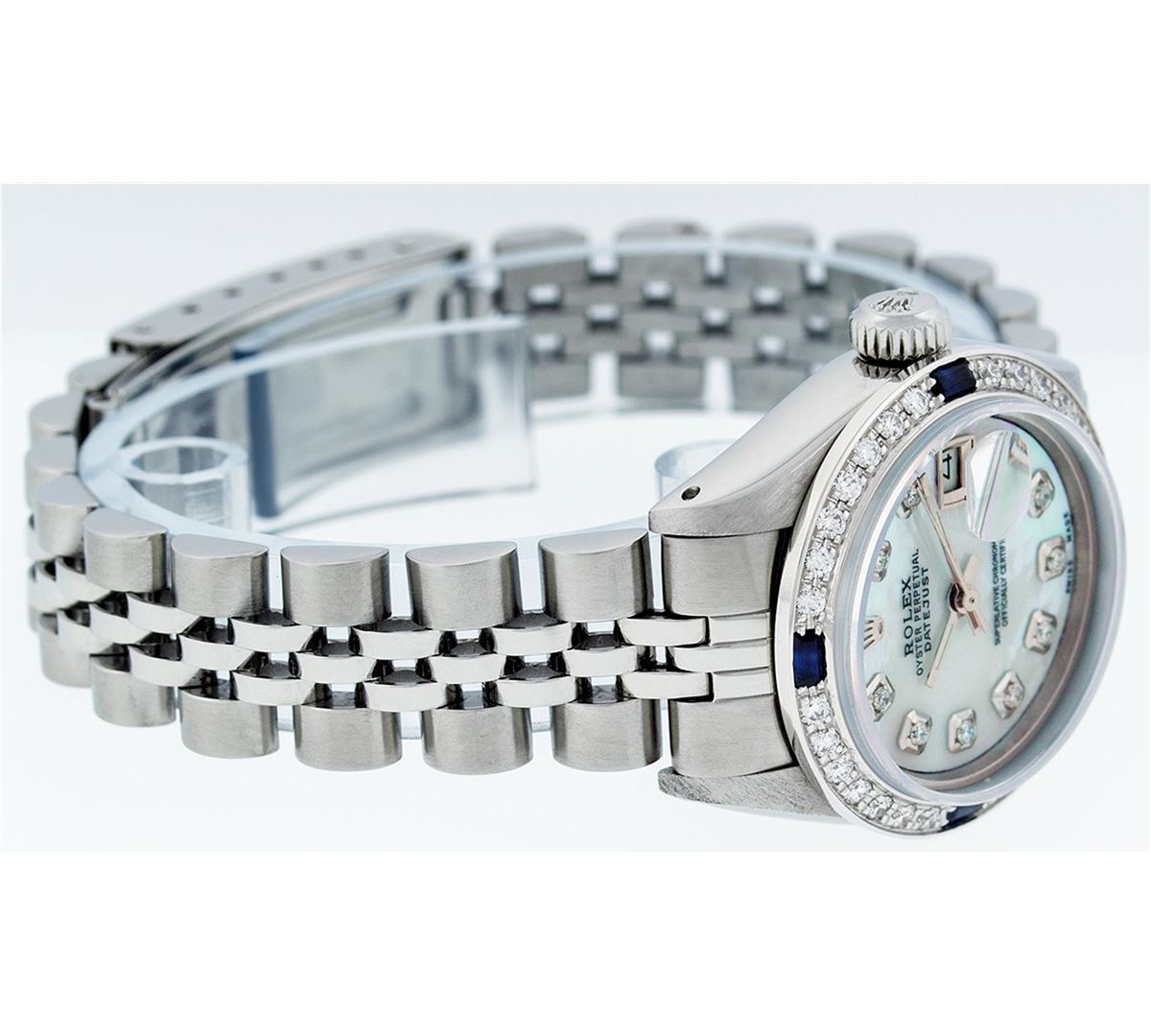 One Ladies Rolex Datejust Polished Bright with Satin Finish, Serviced & Electronically Tested, Stainless Steel Case:26mm, Stainless Steel Crown, Custom Bezel: 18K White Gold Sapphire Beadset Diamond Bezel, Diamond Count: 28 Diamonds + 4 Sapphires Total Weight .70 Carat, Clarity: SI-VS, Color: G to H. Custom Crystal: Synthetic Sapphire Cyclops Lens. Movement: Automatic Winding Movement Caliber 2030. Custom Dial: Blue Mother Of Pearl Diamond, Diamond Count: 10 Diamonds In Dial, Clarity: SI-VS, Color: G to H. Date Window: 3 O'Clock Position Date Display, Model: Datejust. Condition: G-6 Extra Fine. Bracelet: Stainless Steel Jubilee Band. Bright Polish & Satin Finish. 6.0 Inch Length, Adjustable. Standard Clasp, With Rolex Logo. Comes with 6 month warranty.