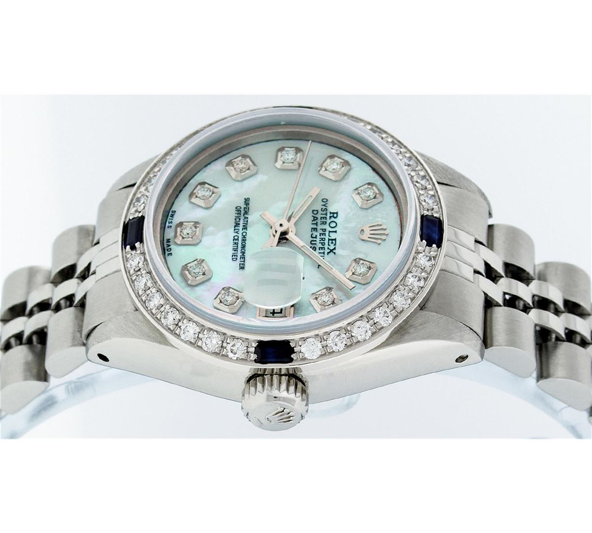 One Ladies Rolex Datejust Polished Bright with Satin Finish, Serviced & Electronically Tested, Stainless Steel Case:26mm, Stainless Steel Crown, Custom Bezel: 18K White Gold Sapphire Beadset Diamond Bezel, Diamond Count: 28 Diamonds + 4 Sapphires Total Weight .70 Carat, Clarity: SI-VS, Color: G to H. Custom Crystal: Synthetic Sapphire Cyclops Lens. Movement: Automatic Winding Movement Caliber 2030. Custom Dial: Blue Mother Of Pearl Diamond, Diamond Count: 10 Diamonds In Dial, Clarity: SI-VS, Color: G to H. Date Window: 3 O'Clock Position Date Display, Model: Datejust. Condition: G-6 Extra Fine. Bracelet: Stainless Steel Jubilee Band. Bright Polish & Satin Finish. 6.0 Inch Length, Adjustable. Standard Clasp, With Rolex Logo. Comes with 6 month warranty.