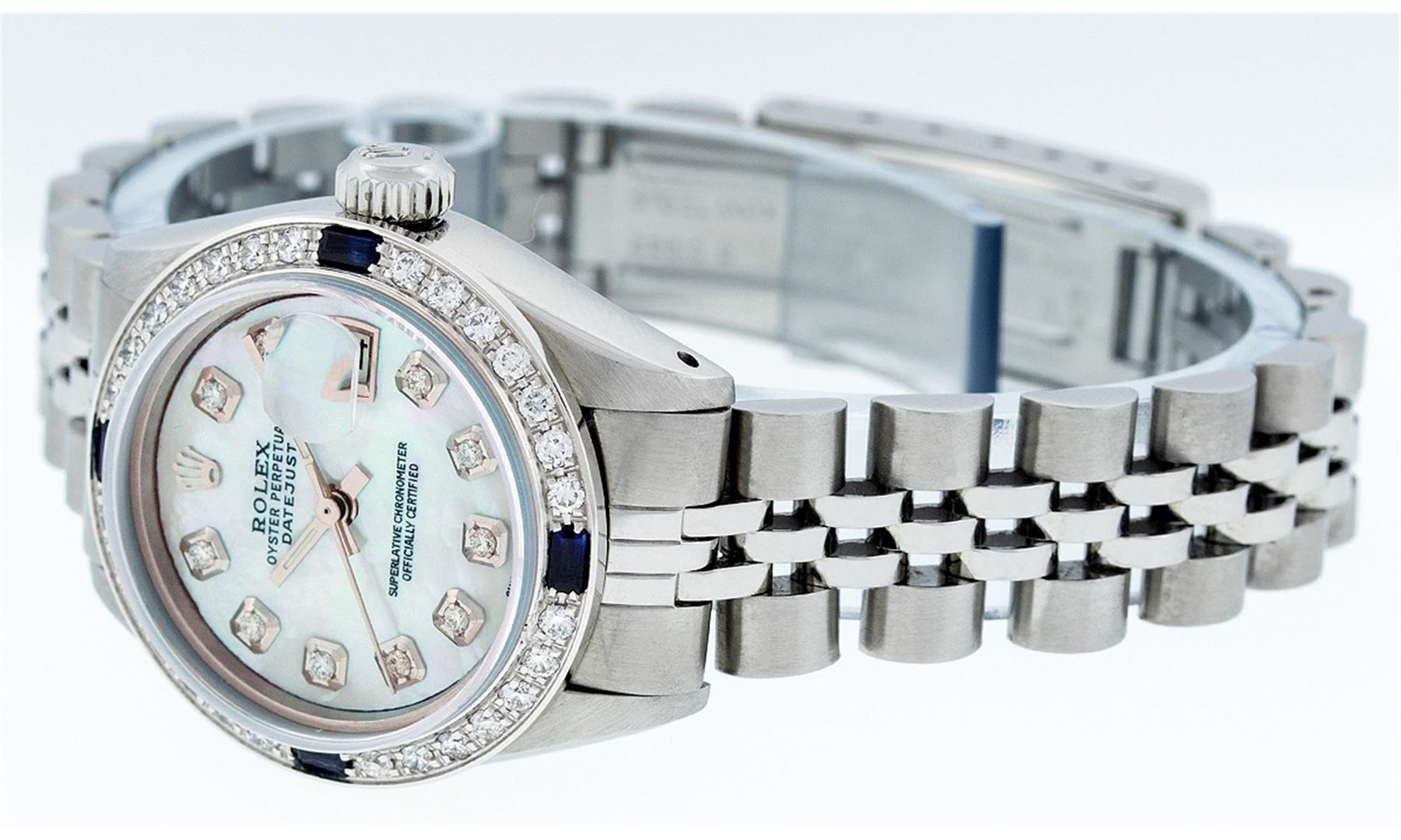 One Ladies Rolex Datejust Polished Bright with Satin Finish, Serviced & Electronically Tested, Stainless Steel Case:26mm, Stainless Steel Crown, Custom Bezel: 18K White Gold Sapphire Beadset Diamond Bezel, Diamond Count: 28 Diamonds + 4 Sapphires Total Weight .70 Carat, Clarity: SI-VS, Color: G to H. Custom Crystal: Synthetic Sapphire Cyclops Lens. Movement: Automatic Winding Movement Caliber 2030. Custom Dial: Blue Mother Of Pearl Diamond, Diamond Count: 10 Diamonds In Dial, Clarity: SI-VS, Color: G to H. Date Window: 3 O'Clock Position Date Display, Model: Datejust. Condition: G-6 Extra Fine. Bracelet: Stainless Steel Jubilee Band. Bright Polish & Satin Finish. 6.0 Inch Length, Adjustable. Standard Clasp, With Rolex Logo. Comes with 6 month warranty.