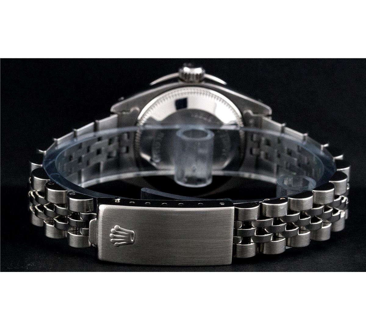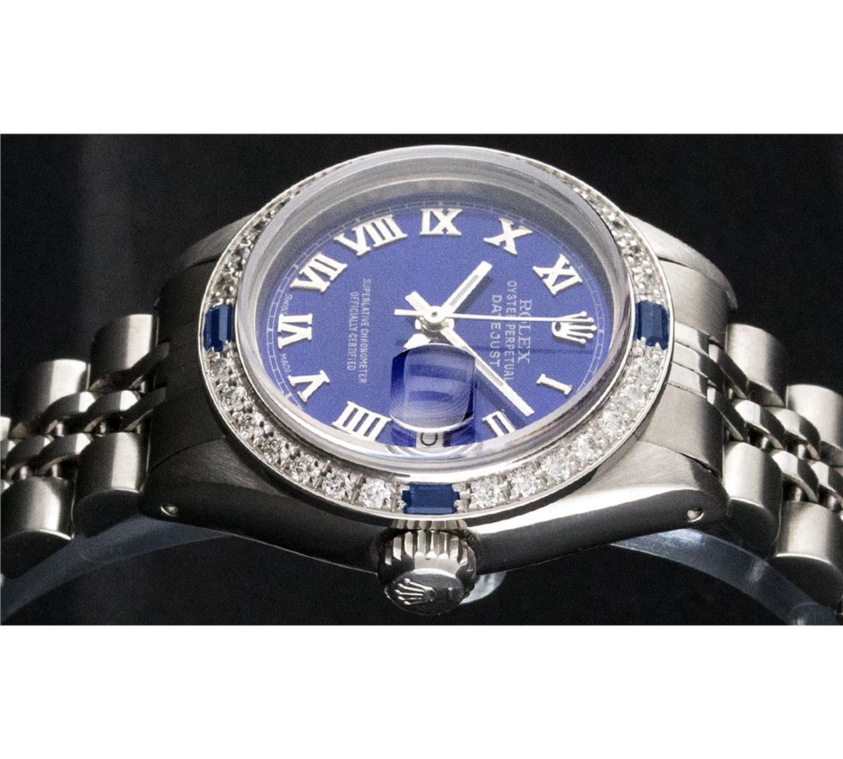 One Ladies Rolex Datejust Polished Bright with Satin Finish, Serviced & Electronically Tested, Stainless Steel Case:26mm, Stainless Steel Crown, Custom Bezel: 18K White Gold Sapphire Beadset Diamond Bezel, Diamond + Gem Count: 28 Diamonds + 4 Sapphires Total Weight .70 Carat, Clarity: SI-VS, Color: G to H. Custom Crystal: Synthetic Sapphire Cyclops Lens. Movement: Automatic Winding Movement Caliber 2030. Custom Dial: Refinished Blue Roman Dial With Square Track. Date Window: 3 O'Clock Position Date Display, Model: Datejust. Condition: G-6 Extra Fine. Bracelet: Stainless Steel Jubilee. Bright Polish & Satin Finish. 5.5 Inch Length, Adjustable. Standard Clasp, With Rolex Logo. Comes with a 6 month warranty card.