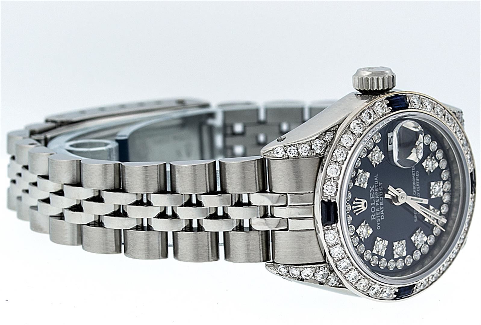 One Ladies Rolex Datejust Polished Bright with Satin Finish, Serviced & Electronically Tested, Stainless Steel Case:26mm, Stainless Steel Crown, Diamond Lugs: 16 Diamonds On Lugs, Clarity: SI-VS, Color: G to H. Custom Bezel: 18K White Gold Sapphire Bezel, Diamond Count: 28 Diamonds + 4 Sapphires, Total Weight 1.00 Carat, Clarity: SI-VS, Color: G to H. Custom Crystal: Synthetic Sapphire Cyclops Lens. Movement: Automatic Winding Movement Caliber 2030. Custom Dial: Refinished Blue With String Diamond Dial, 43 Diamonds in Dial G To H In Color, Clarity: VS. Date Window: 3 O'Clock Position Date Display, Model: Datejust. Condition: G-6 Extra Fine. Bracelet: Stainless Steel Jubilee. Bright Polish & Satin Finish. 6.0 Inch Length, Adjustable. Standard Clasp, With Rolex Logo.
