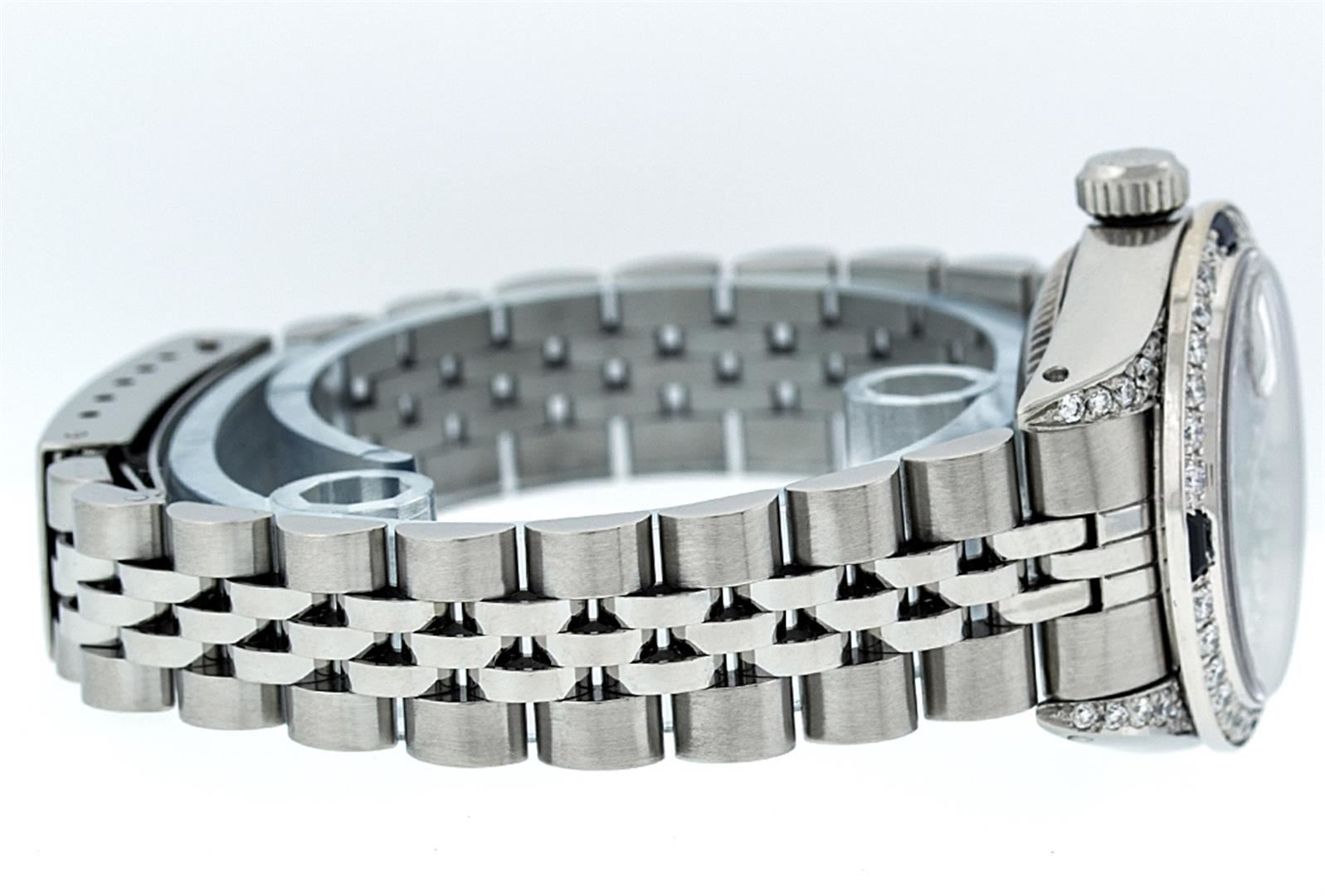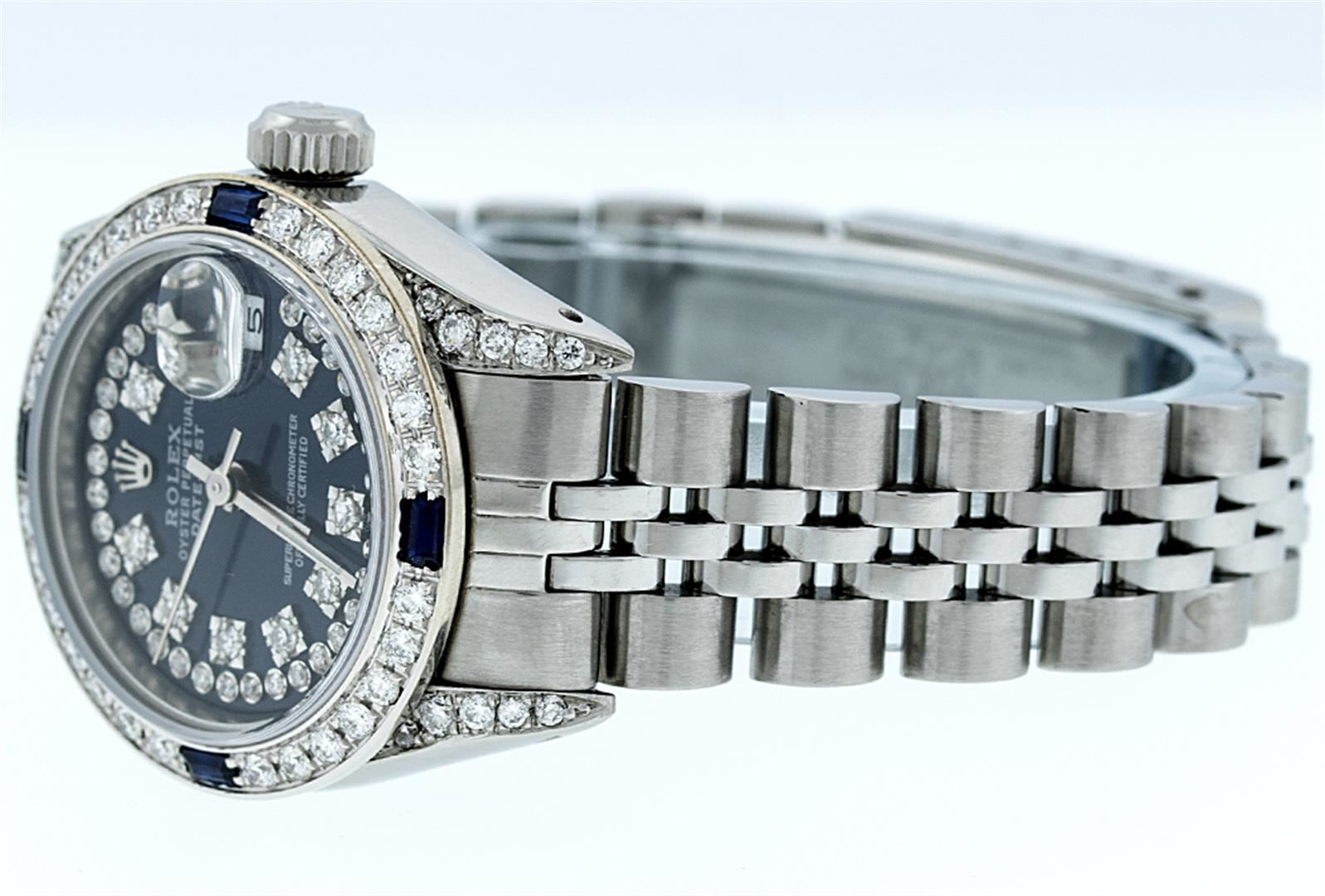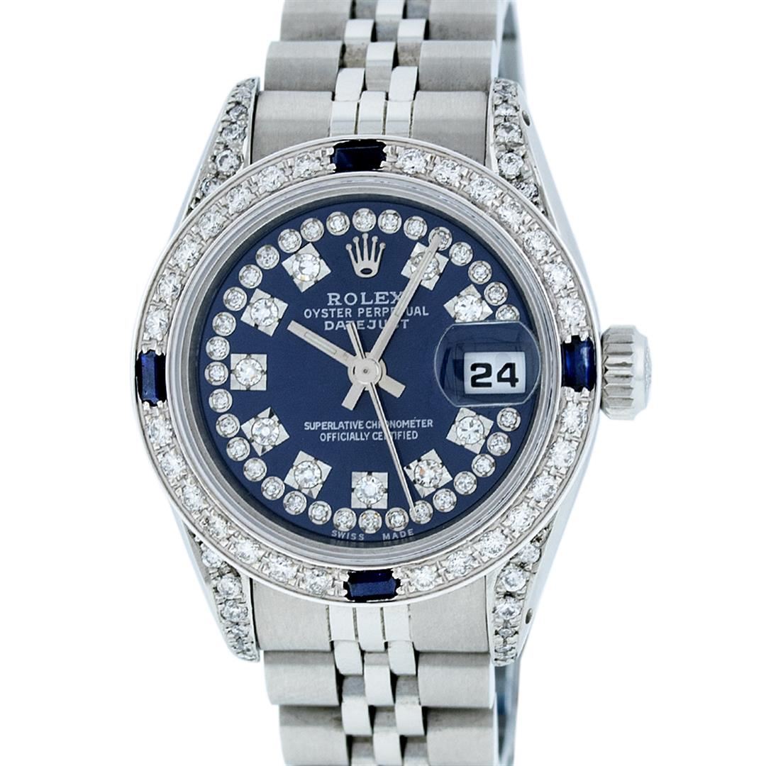 One Ladies Rolex Datejust Polished Bright with Satin Finish, Serviced & Electronically Tested, Stainless Steel Case:26mm, Stainless Steel Crown, Diamond Lugs: 16 Diamonds On Lugs, Clarity: SI-VS, Color: G to H. Custom Bezel: 18K White Gold Sapphire Bezel, Diamond Count: 28 Diamonds + 4 Sapphires, Total Weight 1.00 Carat, Clarity: SI-VS, Color: G to H. Custom Crystal: Synthetic Sapphire Cyclops Lens. Movement: Automatic Winding Movement Caliber 2030. Custom Dial: Refinished Blue With String Diamond Dial, 43 Diamonds in Dial G To H In Color, Clarity: VS. Date Window: 3 O'Clock Position Date Display, Model: Datejust. Condition: G-6 Extra Fine. Bracelet: Stainless Steel Jubilee. Bright Polish & Satin Finish. 6.0 Inch Length, Adjustable. Standard Clasp, With Rolex Logo.