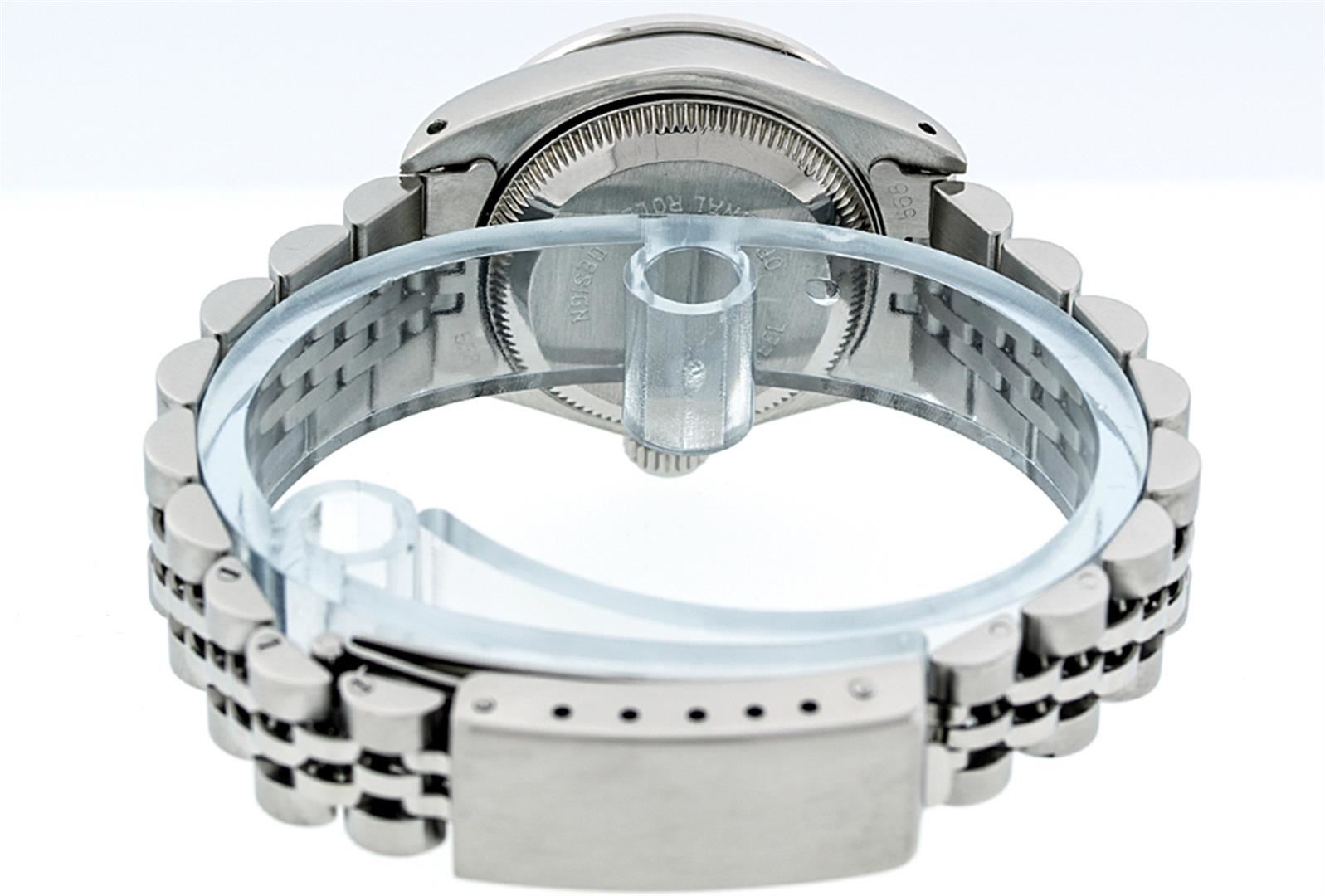 One Ladies Rolex Datejust Polished Bright with Satin Finish, Serviced & Electronically Tested, Stainless Steel Case:26mm, Stainless Steel Crown, Diamond Lugs: 16 Diamonds On Lugs, Clarity: SI-VS, Color: G to H. Custom Bezel: 18K White Gold Sapphire Bezel, Diamond Count: 28 Diamonds + 4 Sapphires, Total Weight 1.00 Carat, Clarity: SI-VS, Color: G to H. Custom Crystal: Synthetic Sapphire Cyclops Lens. Movement: Automatic Winding Movement Caliber 2030. Custom Dial: Refinished Blue With String Diamond Dial, 43 Diamonds in Dial G To H In Color, Clarity: VS. Date Window: 3 O'Clock Position Date Display, Model: Datejust. Condition: G-6 Extra Fine. Bracelet: Stainless Steel Jubilee. Bright Polish & Satin Finish. 6.0 Inch Length, Adjustable. Standard Clasp, With Rolex Logo.