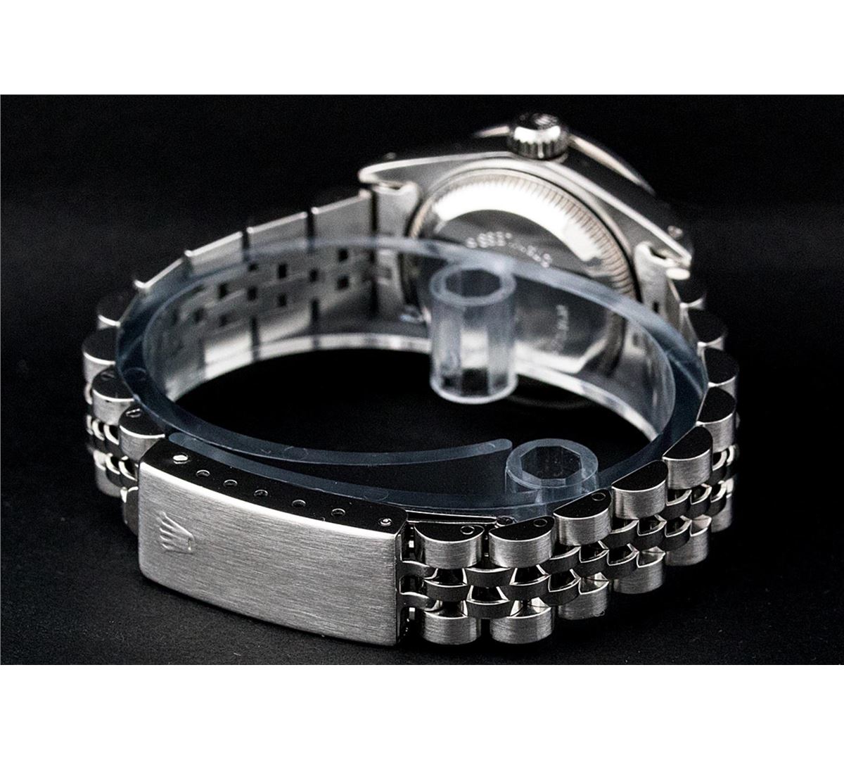 One Ladies Rolex Datejust Polished Bright with Satin Finish, Serviced & Electronically Tested, Stainless Steel Case:26mm, Stainless Steel Crown, Diamond Lugs: 16 Diamonds On Lugs, Clarity: SI-VS, Color: G to H. Custom Bezel: 18K White Gold Sapphire Bezel, Diamond Count: 28 Diamonds + 4 Sapphires, Total Weight 1.00 Carat, Clarity: SI-VS, Color: G to H. Custom Crystal: Synthetic Sapphire Cyclops Lens. Movement: Automatic Winding Movement Caliber 2030. Custom Dial: Refinished Blue With String Diamond Dial, 43 Diamonds in Dial G To H In Color, Clarity: VVS. Date Window: 3 O'Clock Position Date Display, Non Quickset, Model: 6917 Condition: G-6 Extra Fine. Bracelet: Stainless Steel Jubilee. Bright Polish & Satin Finish. 5.5 Inch Length, Adjustable. Standard Clasp, With Rolex Logo.