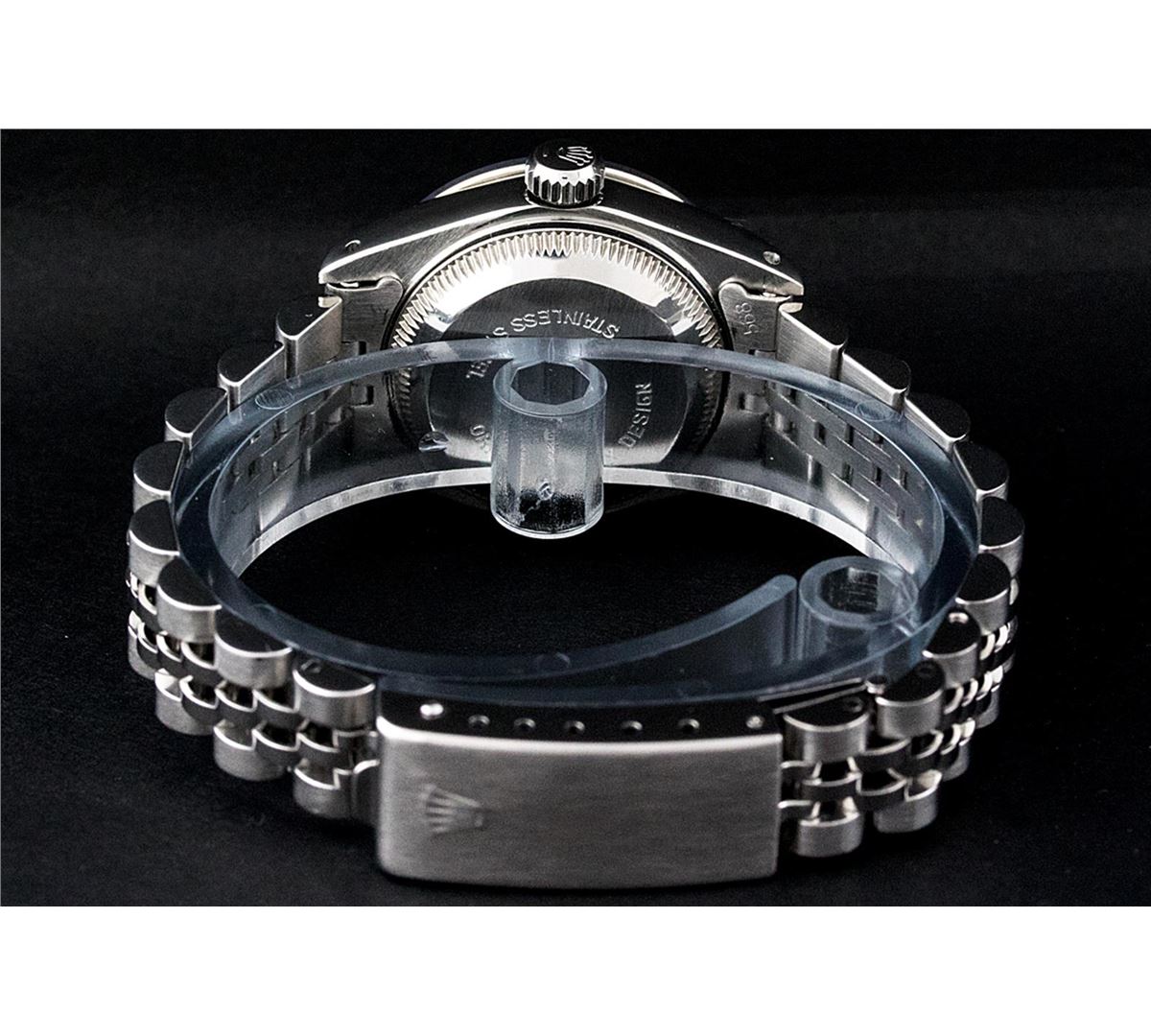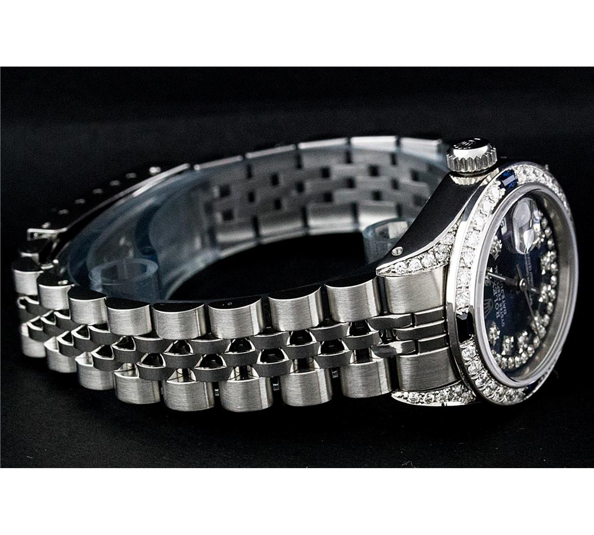 One Ladies Rolex Datejust Polished Bright with Satin Finish, Serviced & Electronically Tested, Stainless Steel Case:26mm, Stainless Steel Crown, Diamond Lugs: 16 Diamonds On Lugs, Clarity: SI-VS, Color: G to H. Custom Bezel: 18K White Gold Sapphire Bezel, Diamond Count: 28 Diamonds + 4 Sapphires, Total Weight 1.00 Carat, Clarity: SI-VS, Color: G to H. Custom Crystal: Synthetic Sapphire Cyclops Lens. Movement: Automatic Winding Movement Caliber 2030. Custom Dial: Refinished Blue With String Diamond Dial, 43 Diamonds in Dial G To H In Color, Clarity: VVS. Date Window: 3 O'Clock Position Date Display, Non Quickset, Model: 6917 Condition: G-6 Extra Fine. Bracelet: Stainless Steel Jubilee. Bright Polish & Satin Finish. 5.5 Inch Length, Adjustable. Standard Clasp, With Rolex Logo.