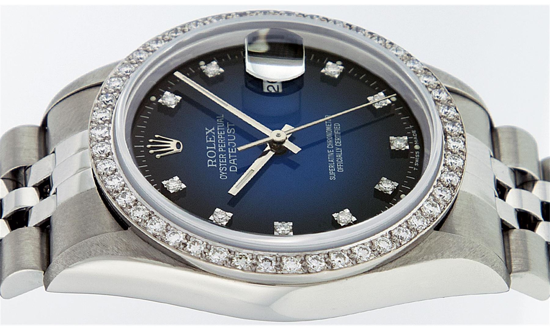 One Mens Stainless Steel Rolex Datejust Polished Bright with Satin Finish, Fully Serviced & Electronically Tested, Stainless Steel Case:36mm, Stainless Steel Crown, Custom Bezel: 18K White Gold Beadset Diamond Bezel, Diamond Count: 46 Diamonds Total Weight 1.40 Carat, Clarity: SI-VS, Color: G to H. Custom Crystal: Synthetic Sapphire Cyclops Lens. Movement: Automatic Winding Movement Caliber 3035. Custom Dial: Blue Vignette Diamond With Line Track & Lumi Dots, 10 Single Cut Diamonds in Dial G To H In Color, Clarity: VVS. Date Window: 3 O'Clock Position Date Display, Quickset, Model: Datejust, Condition: G-6 Extra Fine. Bracelet: Stainless Steel Jubilee. Bright Polish & Satin Finish. 7.0 Inch Length, Adjustable. Standard Clasp, With Rolex Logo.