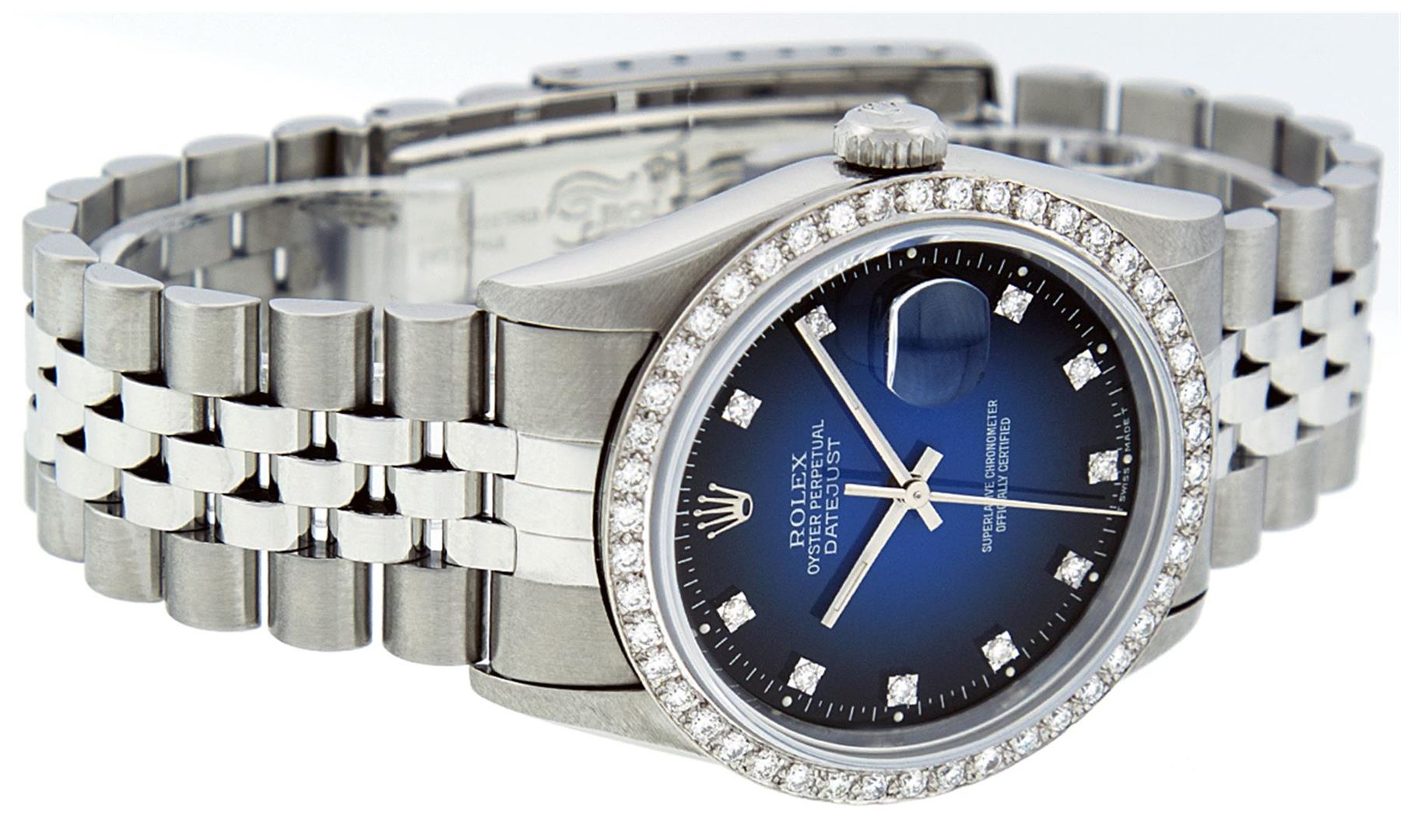 One Mens Stainless Steel Rolex Datejust Polished Bright with Satin Finish, Fully Serviced & Electronically Tested, Stainless Steel Case:36mm, Stainless Steel Crown, Custom Bezel: 18K White Gold Beadset Diamond Bezel, Diamond Count: 46 Diamonds Total Weight 1.40 Carat, Clarity: SI-VS, Color: G to H. Custom Crystal: Synthetic Sapphire Cyclops Lens. Movement: Automatic Winding Movement Caliber 3035. Custom Dial: Blue Vignette Diamond With Line Track & Lumi Dots, 10 Single Cut Diamonds in Dial G To H In Color, Clarity: VVS. Date Window: 3 O'Clock Position Date Display, Quickset, Model: Datejust, Condition: G-6 Extra Fine. Bracelet: Stainless Steel Jubilee. Bright Polish & Satin Finish. 7.0 Inch Length, Adjustable. Standard Clasp, With Rolex Logo.