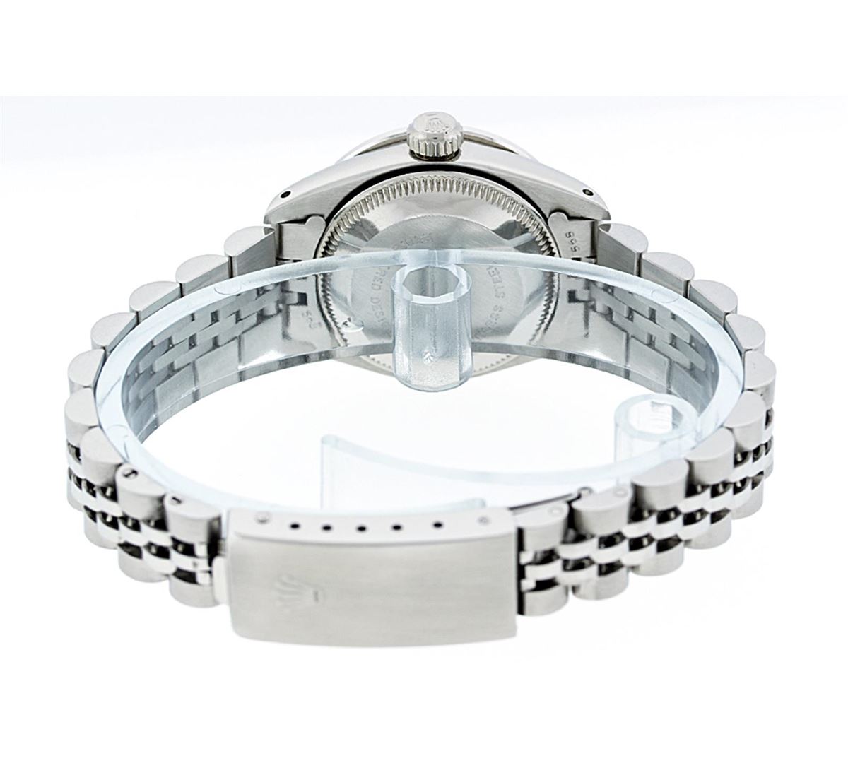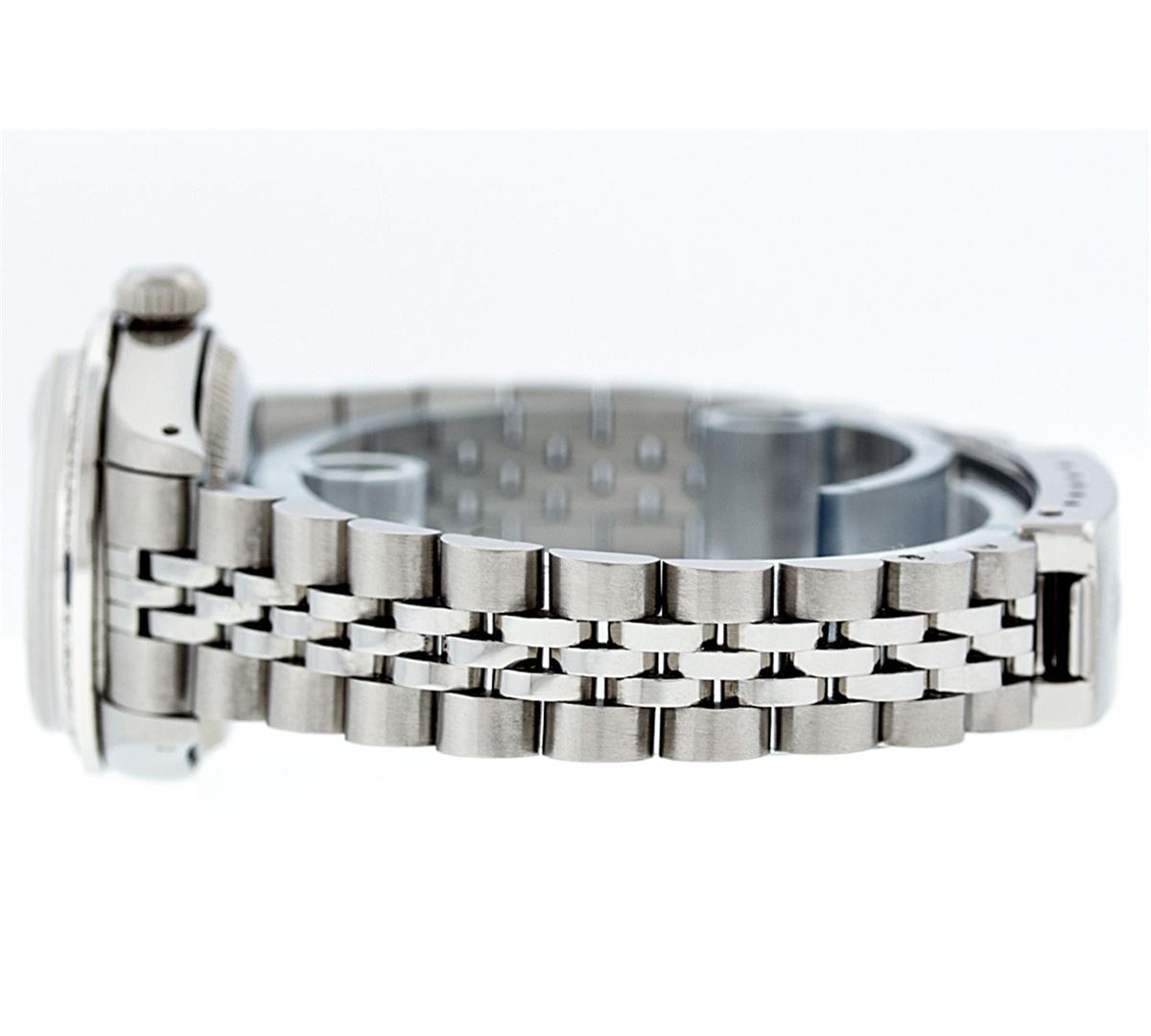 Ladies Rolex Datejust Polished Bright with Satin Finish, Serviced & Electronically Tested, Stainless Steel Case:26mm, Stainless Steel Crown, Custom Bezel: 18K White Gold Sapphire Beadset Diamond Bezel, Diamond + Gem Count: 28 Diamonds + 4 Sapphires Total Weight .70 Carat, Clarity: SI-VS, Color: G to H. Custom Crystal: Synthetic Sapphire Cyclops Lens. Movement: Automatic Winding Movement Caliber 2030. Custom Dial: Refinished Blue Vignette With Diamond Hour Markers. Date Window: 3 O'Clock Position Date Display, Model: 6917 Condition: G-6 Extra Fine. Bracelet: Stainless Steel Jubilee. Bright Polish & Satin Finish. 5.5 Inch Length, Adjustable. Standard Clasp, With Rolex Logo.
