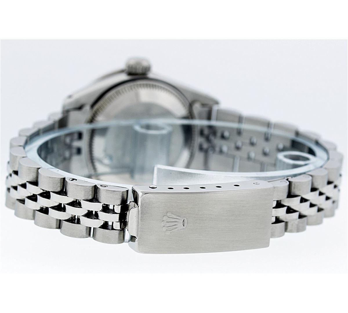 Ladies Rolex Datejust Polished Bright with Satin Finish, Serviced & Electronically Tested, Stainless Steel Case:26mm, Stainless Steel Crown, Custom Bezel: 18K White Gold Sapphire Beadset Diamond Bezel, Diamond + Gem Count: 28 Diamonds + 4 Sapphires Total Weight .70 Carat, Clarity: SI-VS, Color: G to H. Custom Crystal: Synthetic Sapphire Cyclops Lens. Movement: Automatic Winding Movement Caliber 2030. Custom Dial: Refinished Blue Vignette With Diamond Hour Markers. Date Window: 3 O'Clock Position Date Display, Model: 6917 Condition: G-6 Extra Fine. Bracelet: Stainless Steel Jubilee. Bright Polish & Satin Finish. 5.5 Inch Length, Adjustable. Standard Clasp, With Rolex Logo.