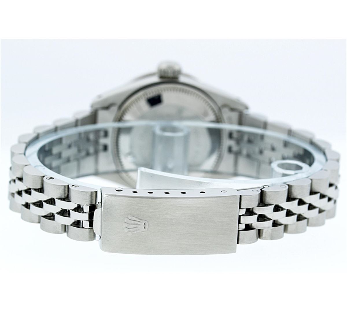 Ladies Rolex Datejust Polished Bright with Satin Finish, Serviced & Electronically Tested, Stainless Steel Case:26mm, Stainless Steel Crown, Custom Bezel: 18K White Gold Sapphire Beadset Diamond Bezel, Diamond + Gem Count: 28 Diamonds + 4 Sapphires Total Weight .70 Carat, Clarity: SI-VS, Color: G to H. Custom Crystal: Synthetic Sapphire Cyclops Lens. Movement: Automatic Winding Movement Caliber 2030. Custom Dial: Refinished Blue Vignette With Diamond Hour Markers. Date Window: 3 O'Clock Position Date Display, Model: 6917 Condition: G-6 Extra Fine. Bracelet: Stainless Steel Jubilee. Bright Polish & Satin Finish.  5.5 Inch Length, Adjustable. Standard Clasp, With Rolex Logo.
