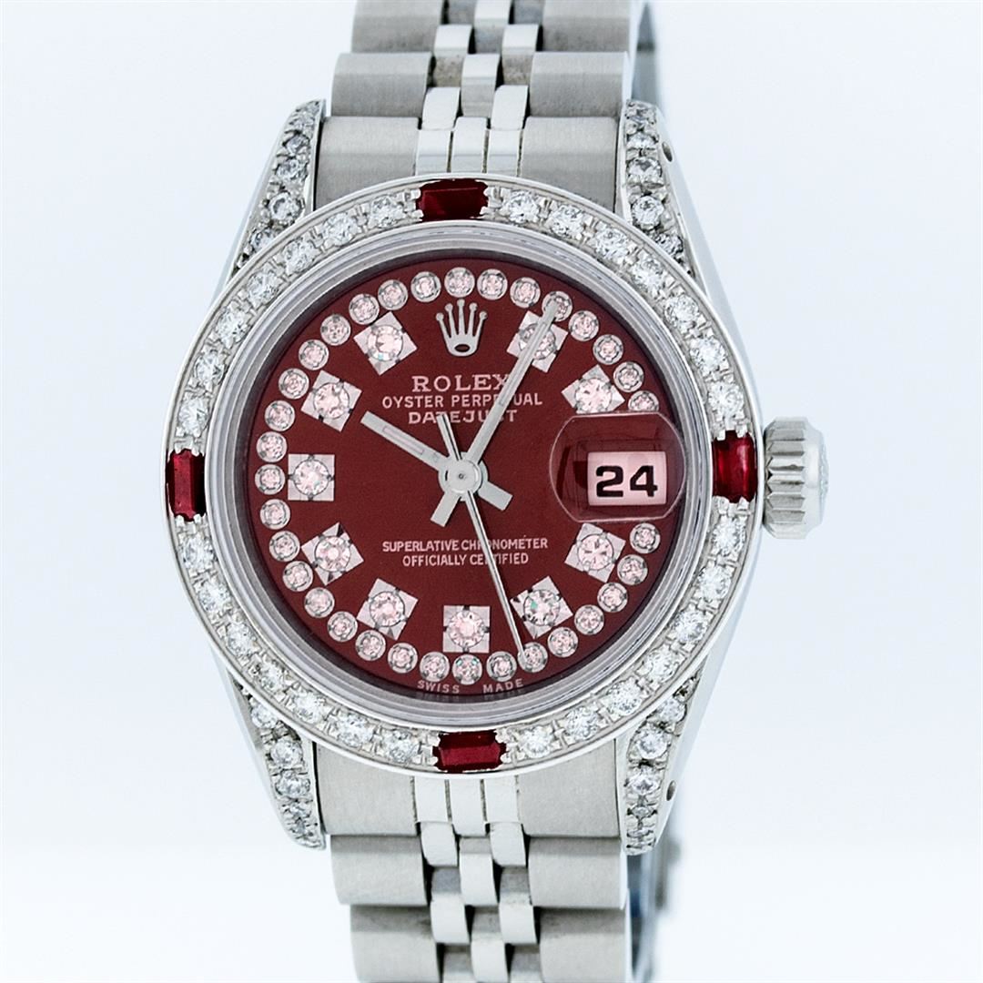 One Ladies Rolex Datejust Polished Bright with Satin Finish, Serviced & Electronically Tested, Stainless Steel Case:26mm, Stainless Steel Crown, Diamond Lugs: 16 Diamonds On Lugs, Clarity: SI-VS, Color: G to H. Custom Bezel: 18K White Gold Ruby Beadset Bezel, Diamond Count: 28 Diamonds + 4 Rubies, Total Weight 1.00 Carat, Clarity: SI-VS, Color: G to H. Custom Crystal: Synthetic Sapphire Cyclops Lens. Movement: Automatic Winding Movement Caliber 2030. Custom Dial: Refinished Burgundy With String Diamond Dial, 43 Diamonds in Dial G To H In Color, Clarity: VVS. Date Window: 3 O'Clock Position Date Display, Model: Datejust Condition: G-6 Extra Fine. Bracelet: Stainless Steel Jubilee. Bright Polish & Satin Finish. 5.5 Inch Length, Adjustable. Standard Clasp, With Rolex Logo. Comes with a 6 month warranty card.
