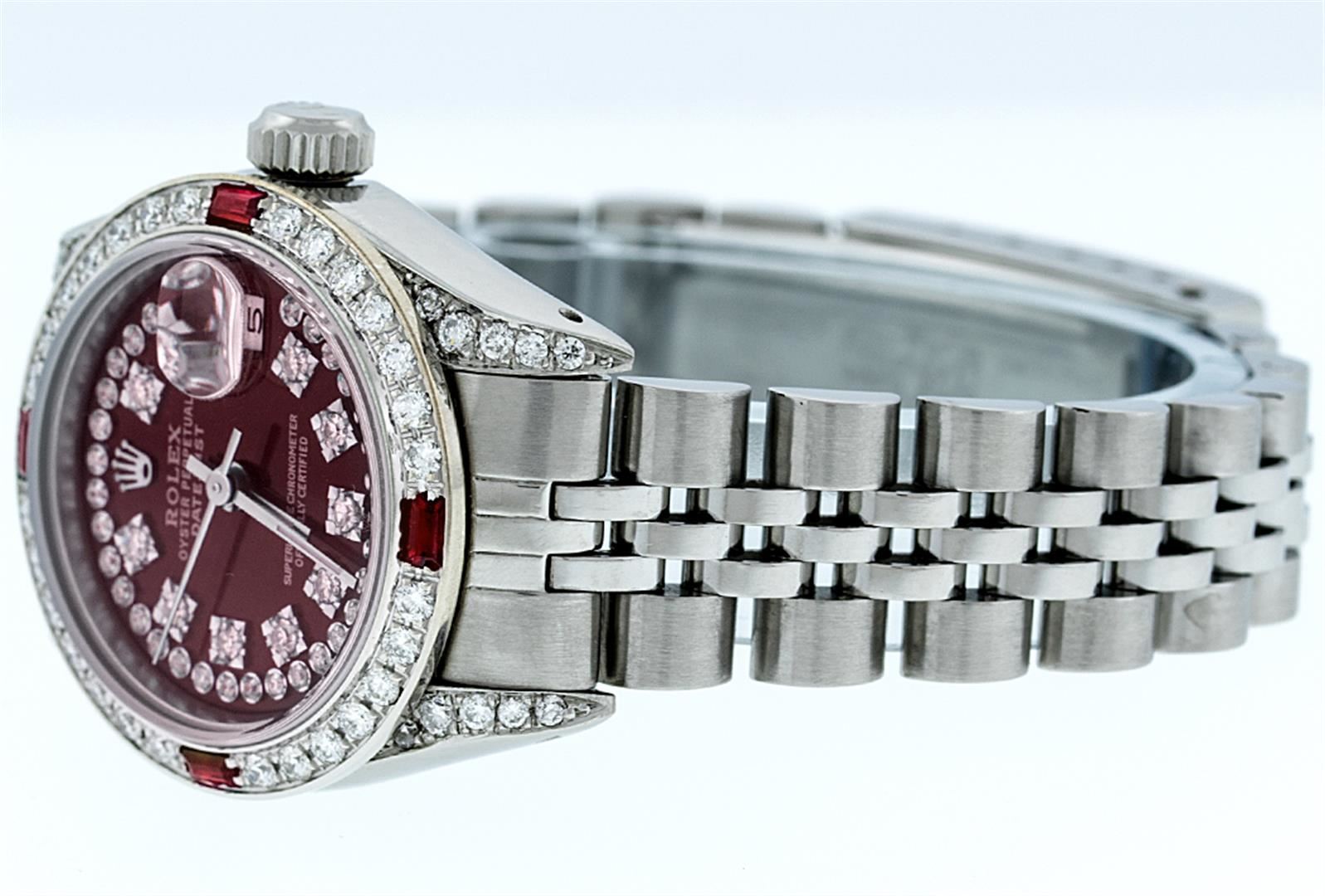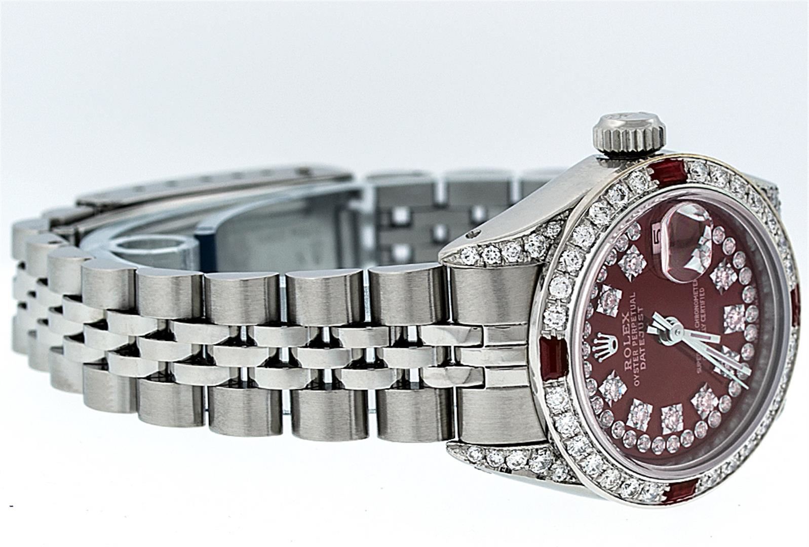 One Ladies Rolex Datejust Polished Bright with Satin Finish, Serviced & Electronically Tested, Stainless Steel Case:26mm, Stainless Steel Crown, Diamond Lugs: 16 Diamonds On Lugs, Clarity: SI-VS, Color: G to H. Custom Bezel: 18K White Gold Ruby Beadset Bezel, Diamond Count: 28 Diamonds + 4 Rubies, Total Weight 1.00 Carat, Clarity: SI-VS, Color: G to H. Custom Crystal: Synthetic Sapphire Cyclops Lens. Movement: Automatic Winding Movement Caliber 2030. Custom Dial: Refinished Burgundy With String Diamond Dial, 43 Diamonds in Dial G To H In Color, Clarity: VVS. Date Window: 3 O'Clock Position Date Display, Model: Datejust Condition: G-6 Extra Fine. Bracelet: Stainless Steel Jubilee. Bright Polish & Satin Finish. 5.5 Inch Length, Adjustable. Standard Clasp, With Rolex Logo. Comes with a 6 month warranty card.