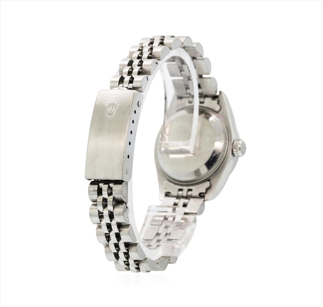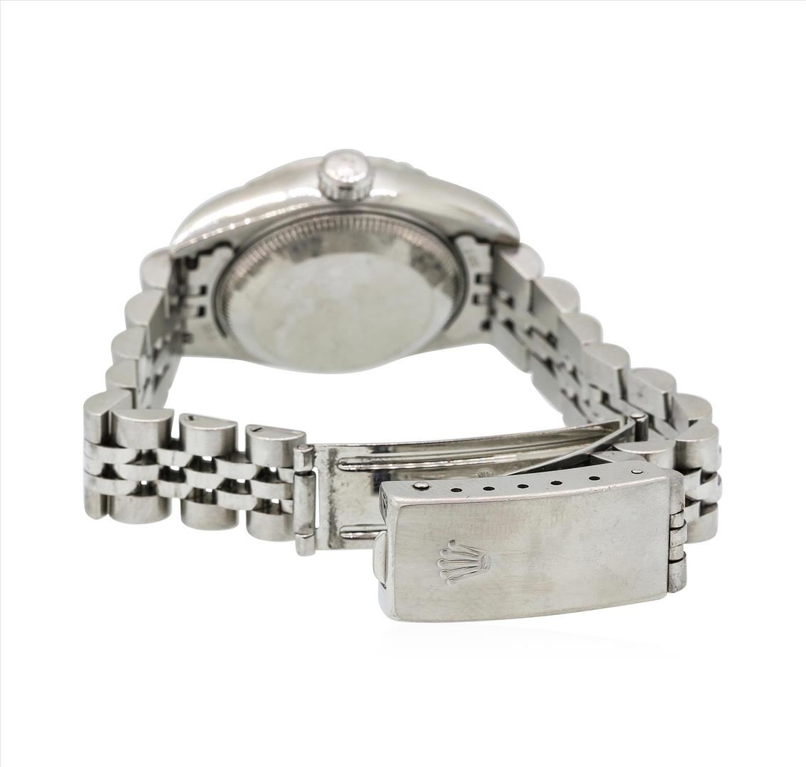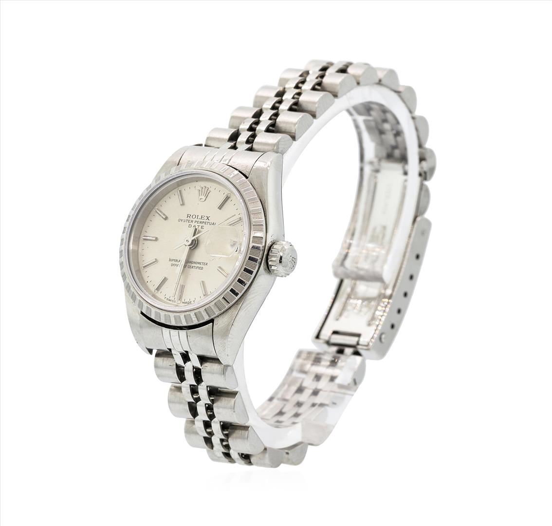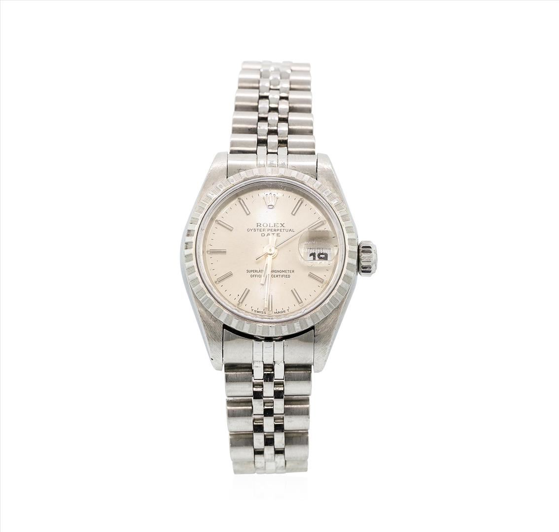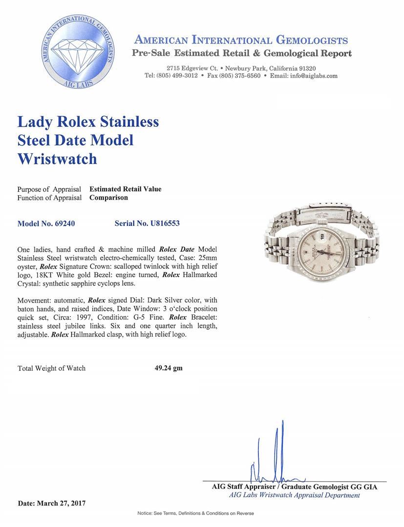 One ladies, hand crafted & machine milled Rolex Date Model Stainless Steel wristwatch electro-chemically tested, Case: 25mm oyster, Rolex Signature Crown: scalloped twin lock with high relief logo, 18KT White gold Bezel: engine turned, Rolex Hallmarked Crystal: synthetic sapphire cyclops lens. Movement: automatic, Rolex signed Dial: Dark Silver color, with baton hands, and raised indices, Date Window: 3 o'clock position quick set, Circa: 1997, Condition: G-5 Fine. Rolex Bracelet: stainless steel jubilee links. Six and one quarter inch length, adjustable. Rolex Hallmarked clasp, with high relief logo. Total Weight of Watch 49.24gm. AIG Appraised.