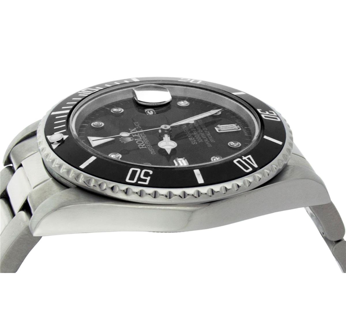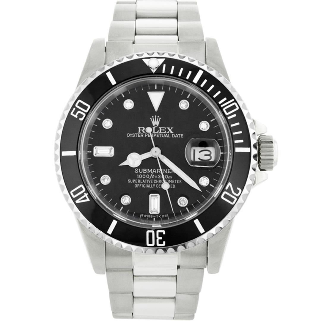 One Mens Rolex Submariner With Date Polished, Serviced & Electronically Tested, Stainless Steel Case:41mm, Stainless Steel Crown, Bezel: Stainless Steel Rotatable Bezel With Black Insert. Crystal: Synthetic Sapphire Cyclops Lens. Movement: Automatic Winding Movement Caliber 3135. Custom Dial: Black Submariner Diamond Dial, Diamond Count: 8 Diamonds + 2 Baguette Diamonds, Color: G To H, Clarity: SI-VS. Date Window: 3 O'Clock Position Date Display, Model: Submariner 16610, Quickset Condition: G-6 Extra Fine. Bracelet: Stainless Steel Oyster. Bright Polish & Satin Finish. 6.75 Inch Length, Adjustable. Standard Clasp, With Rolex Logo.