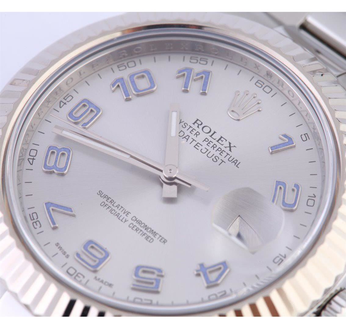 One gents stainless steel Rolex DateJust II wristwatch. Model Name/Number: DateJust II 116334. The watch features automatic movement with date, quickset, scratch-resistant sapphire crystal, waterproof screw-down crown, inner reflector ring engraved with serial number. Case: Stainless steel with 18kt white gold fluted bezel (41mm). Dial: Satin Gray (Rhodium) with Arabic hour markers. Bracelet: Stainless steel Oyster.
