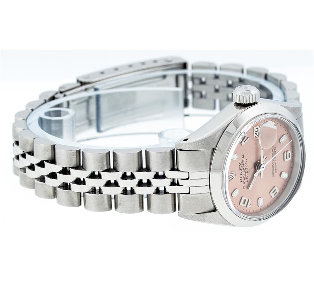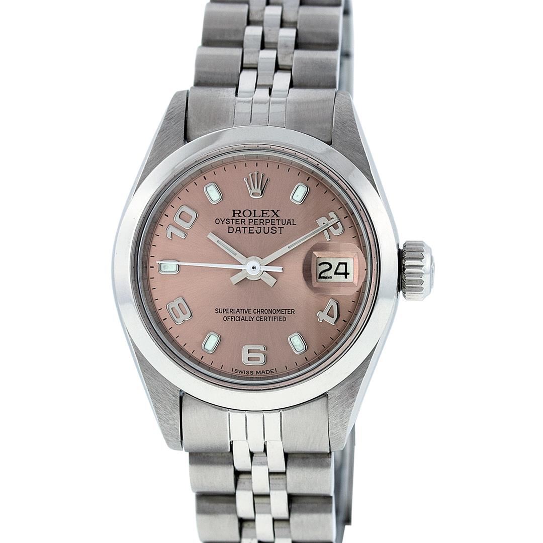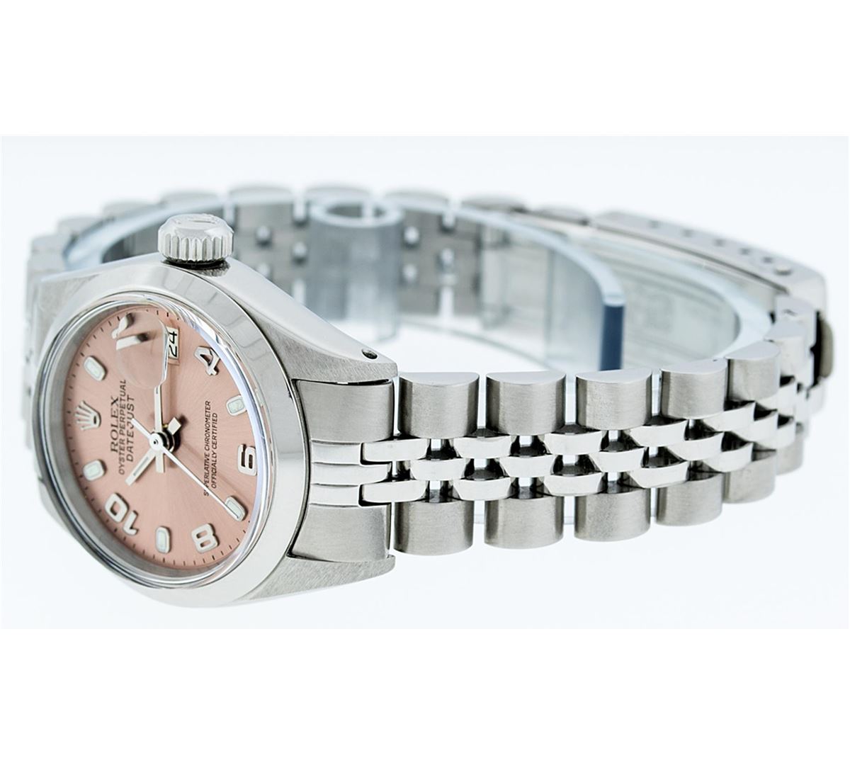One Ladies Rolex Datejust Polished Bright with Satin Finish, Serviced & Electronically Tested, Stainless Steel Case:26mm, Stainless Steel Crown, Bezel: Stainless Steel Smooth. Custom Crystal: Acrylic Cyclops Lens. Movement: Automatic Winding Movement Caliber 2030. Dial: Salmon Arabic Dial. Date Window: 3 O'clock Position Date Display, Model: Datejust. Condition: G-6 Extra Fine. Bracelet: Stainless Steel Jubilee Band. Bright Polish & Satin Finish. 6.0 Inch Length, Adjustable. Standard Clasp, With Rolex Logo. Comes with 6 month warranty.