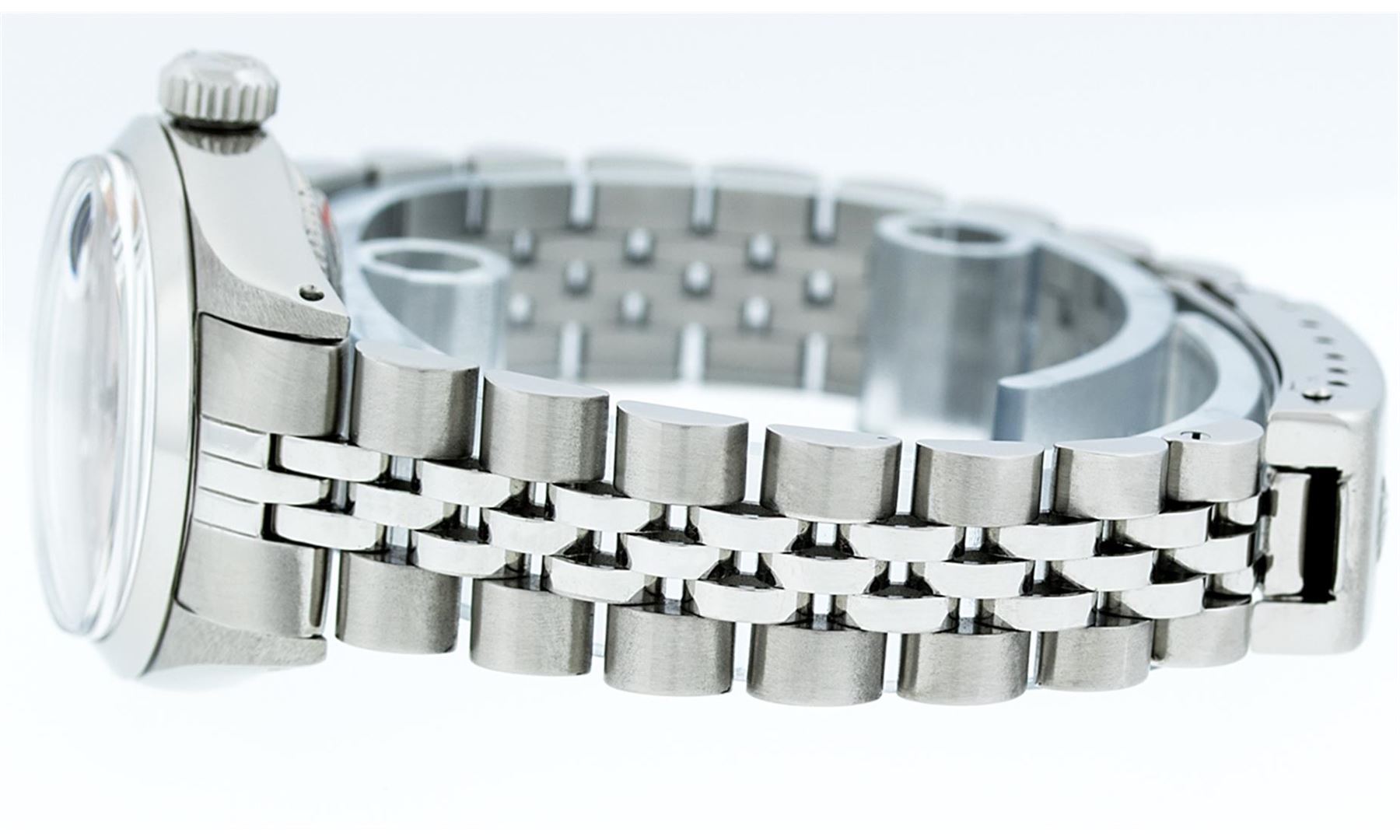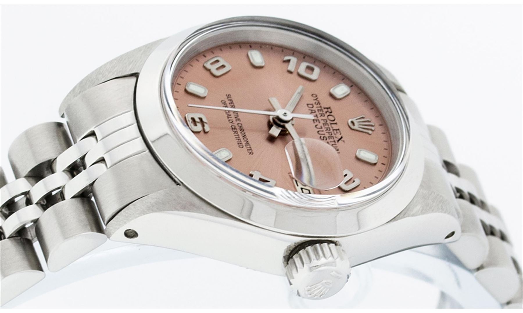 One Ladies Rolex Datejust Polished Bright with Satin Finish, Serviced & Electronically Tested, Stainless Steel Case:26mm, Stainless Steel Crown, Bezel: Stainless Steel Smooth. Custom Crystal: Acrylic Cyclops Lens. Movement: Automatic Winding Movement Caliber 2030. Dial: Salmon Arabic Dial. Date Window: 3 O'clock Position Date Display, Model: Datejust. Condition: G-6 Extra Fine. Bracelet: Stainless Steel Jubilee Band. Bright Polish & Satin Finish. 6.0 Inch Length, Adjustable. Standard Clasp, With Rolex Logo. Comes with 6 month warranty.