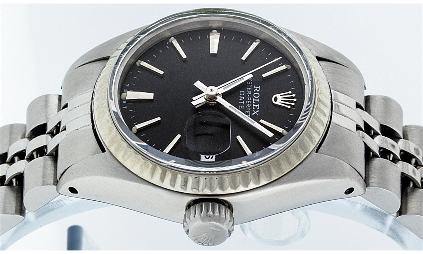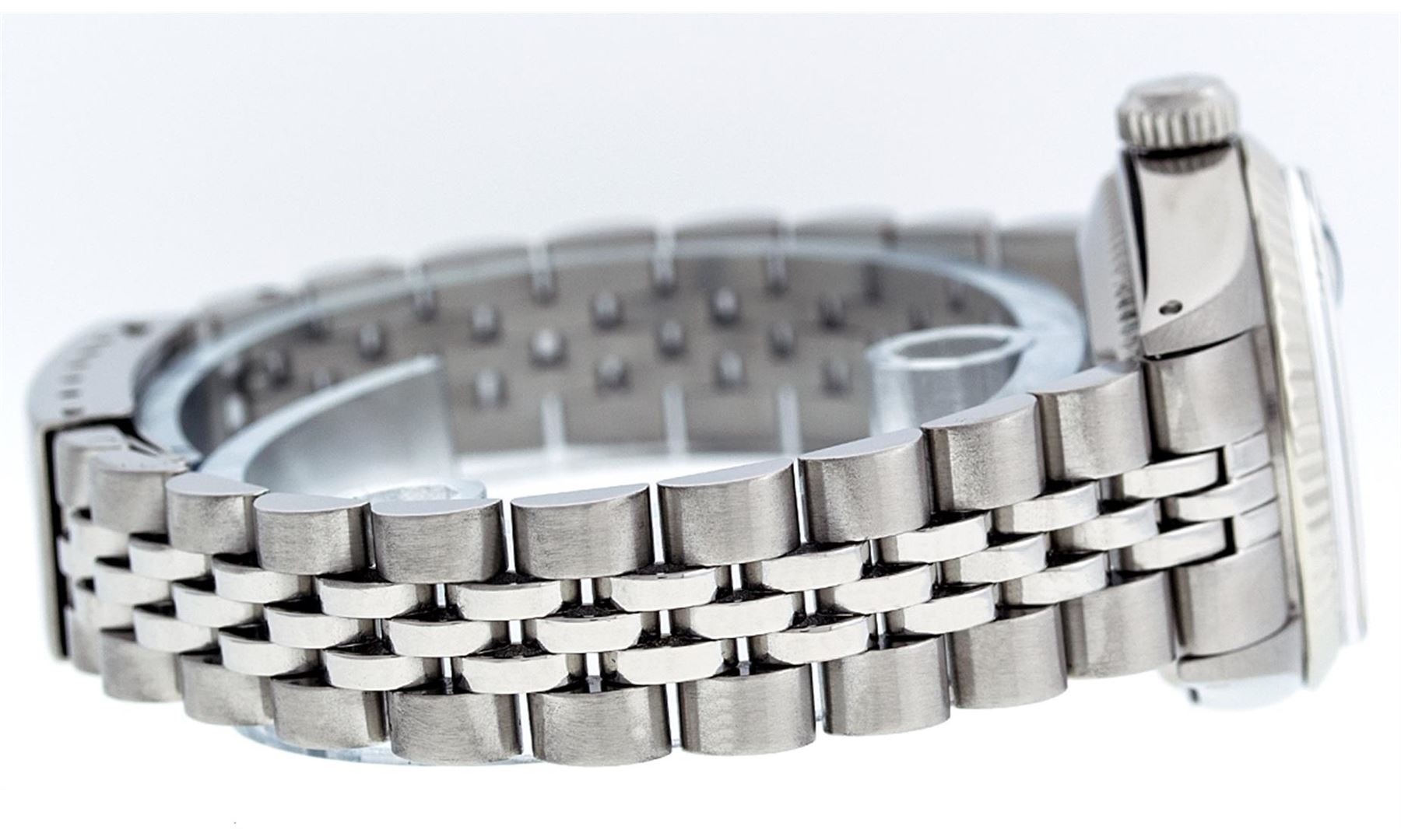 One Ladies Rolex Datejust Polished Bright with Satin Finish, Serviced & Electronically Tested, Stainless Steel Case:26mm, Stainless Steel Crown, Bezel: 14K Fluted Bezel. Custom Crystal: Acrylic Cyclops Lens. Movement: Automatic Winding Movement Caliber 2030. Dial: Black Index Dial. Date Window: 3 O'Clock Position Date Display, Model: Datejust. Condition: G-6 Extra Fine. Bracelet: Stainless Steel Jubilee Band. Bright Polish & Satin Finish. 6.0 Inch Length, Adjustable. Standard Clasp, With Rolex Logo. Comes with 6 month warranty.