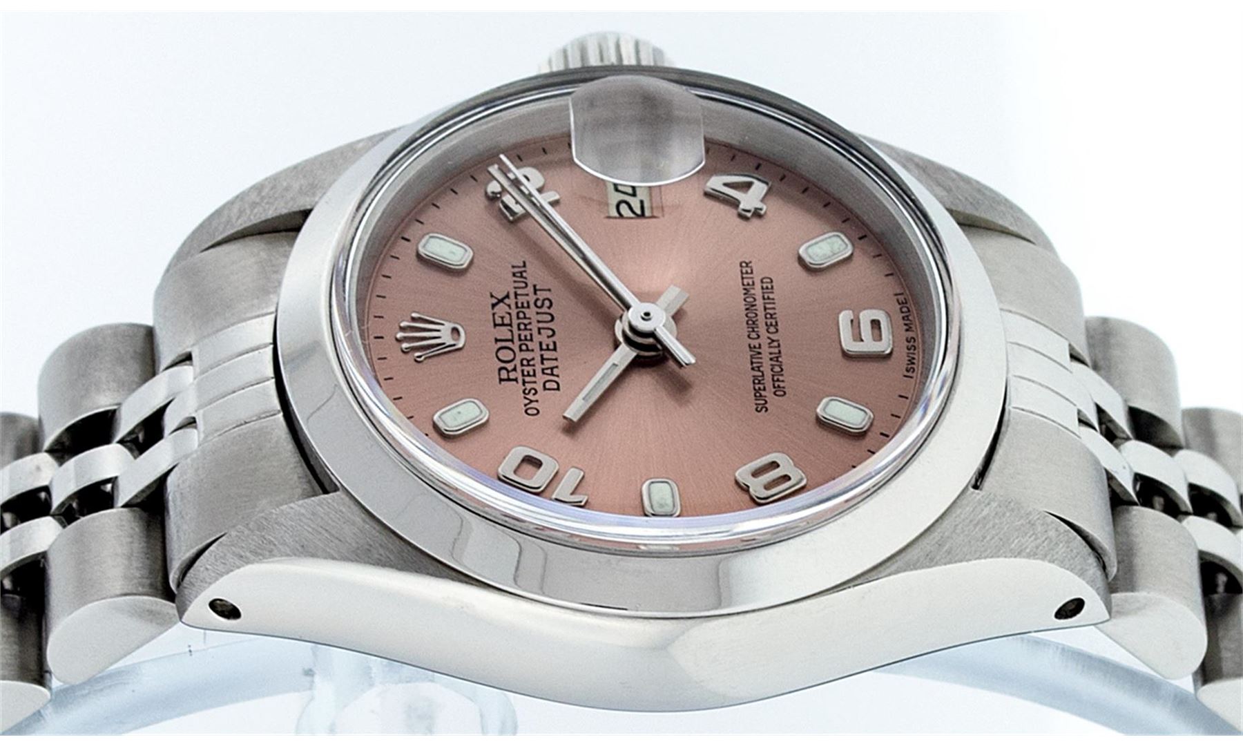 One Ladies Rolex Datejust Polished Bright with Satin Finish, Serviced & Electronically Tested, Stainless Steel Case:26mm, Stainless Steel Crown, Bezel: Stainless Steel Smooth. Custom Crystal: Acrylic Cyclops Lens. Movement: Automatic Winding Movement Caliber 2030. Dial: Salmon Arabic Dial. Date Window: 3 O'clock Position Date Display, Model: Datejust. Condition: G-6 Extra Fine. Bracelet: Stainless Steel Jubilee Band. Bright Polish & Satin Finish. 6.0 Inch Length, Adjustable. Standard Clasp, With Rolex Logo. Comes with 6 month warranty.