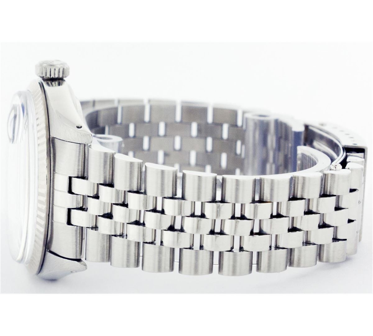 One Mens Rolex Datejust Polished Bright with Satin Finish, Serviced & Electronically Tested, Stainless Steel Case:36mm, Stainless Steel Crown, Original Bezel: 14K White Gold Fluted Bezel. Custom Crystal: Synthetic Sapphire Cyclops Lens. Movement: Automatic Winding Movement Caliber 3035. Custom Dial: Blue Dial With Diamond Hour Markers and Track + Baguette Diamonds On The 6 & 9 Hour Marker, Diamond Count: 8 Diamonds + 2 Baguettes in Dial G To H In Color, Si-VS Clarity. Date Window: 3 O'Clock Position Date Display, Quickset, Model: 16014 Condition: G-6 Extra Fine. Bracelet:Stainless Steel Jubilee. Bright Polish & Satin Finish. 6.5 Inch Length, Adjustable. Standard Clasp, With Rolex Logo.