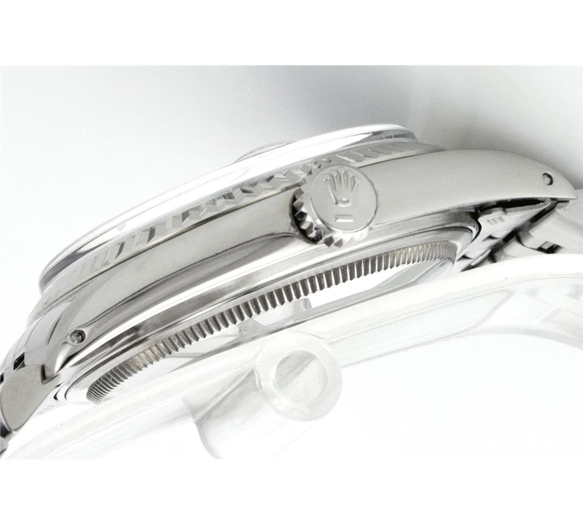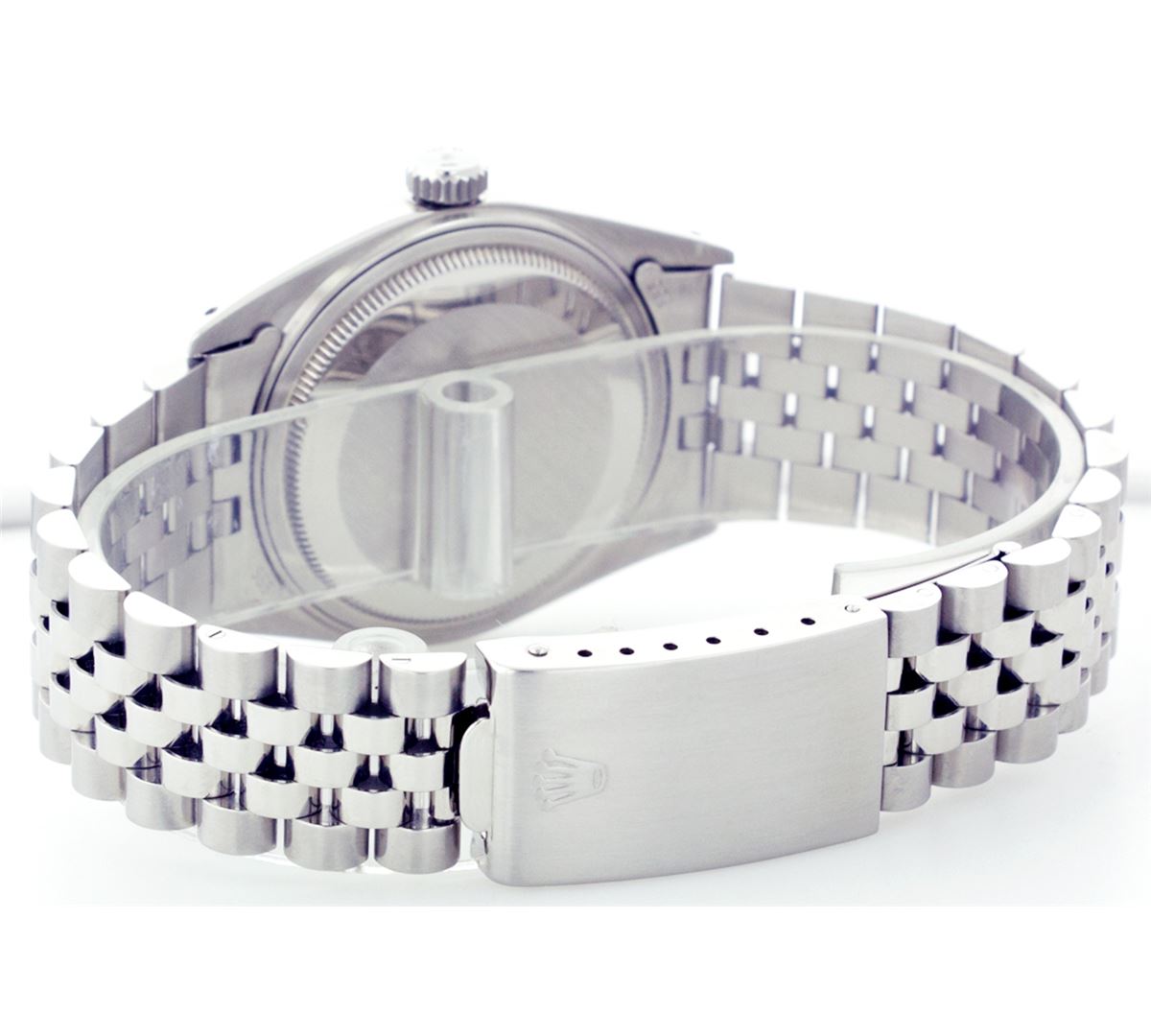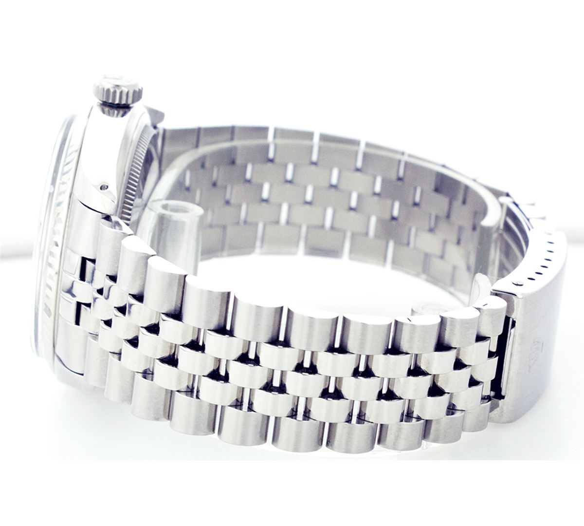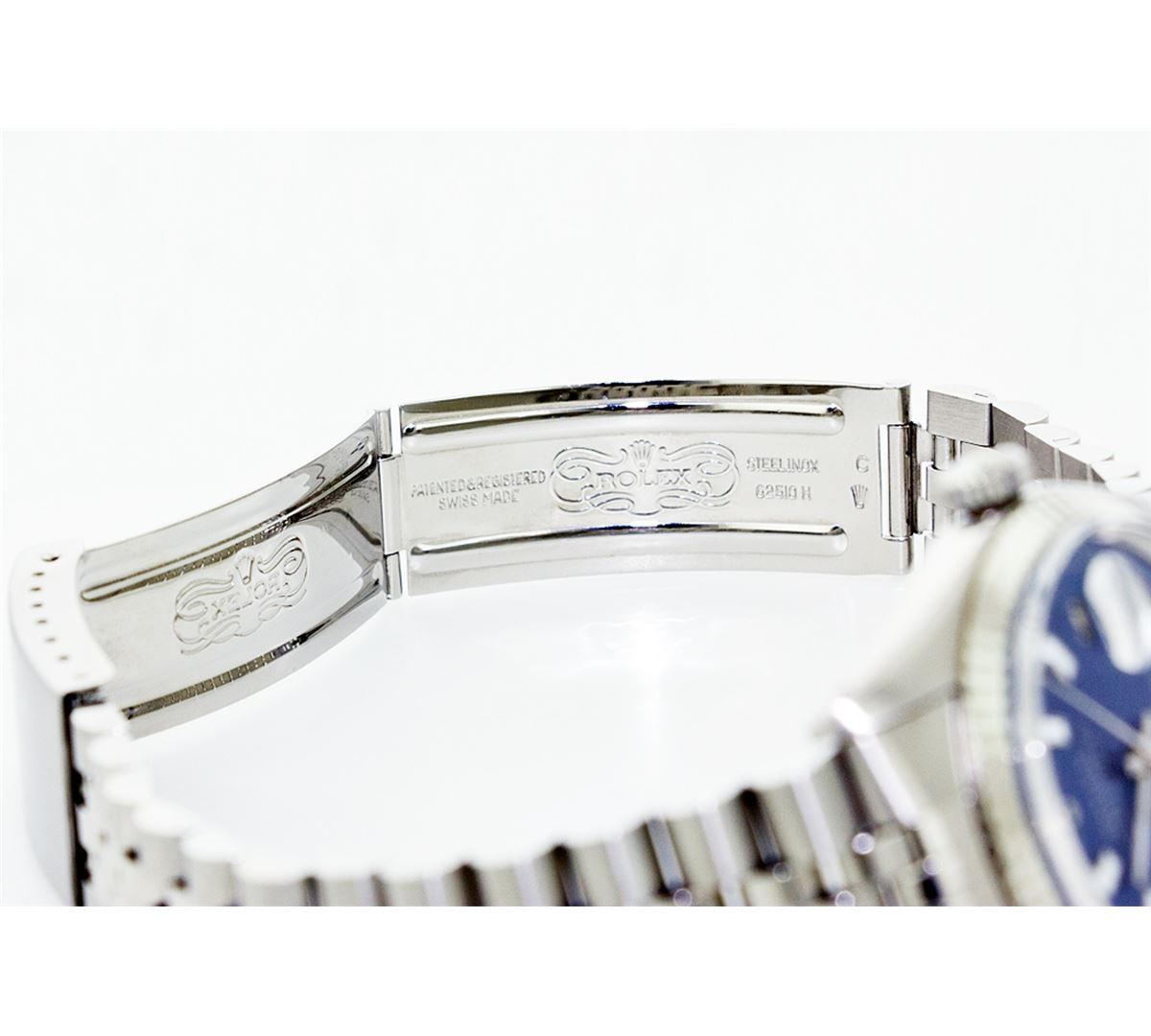 One Gents Rolex Datejust Polished Bright with Satin Finish, Serviced & Electronically Tested, Stainless Steel Case: 36mm, Stainless Steel Crown, Original Bezel: 14K White Gold Fluted Bezel. Custom Crystal: Synthetic Sapphire Cyclops Lens. Movement: Automatic Winding Movement Caliber 3035. Custom Dial: Blue Index Dial. Date Window: 3 O'Clock Position Date Display, Quickset, Model: 16014 Condition: G-6 Extra Fine. Bracelet: Stainless Steel Jubilee. Bright Polish & Satin Finish. 6.5 Inch Length, Adjustable. Standard Clasp, With Rolex Logo.