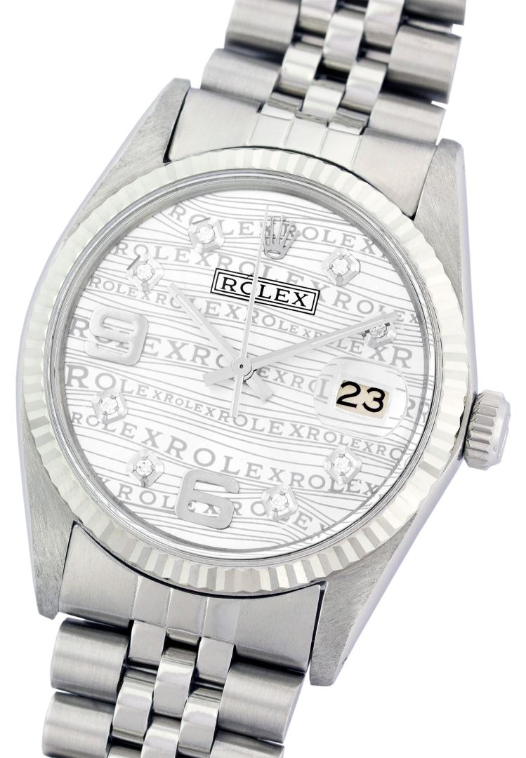 One Gents Rolex Datejust Polished, Serviced & Electronically Tested, Stainless Steel Case:36mm, Stainless Steel Crown, Bezel: 18K White Gold Fluted Bezel. Custom Crystal: Synthetic Sapphire Cyclops Lens. Movement: Automatic Winding Movement Caliber 3035. Custom Dial: Silver Wave Dial With Diamond Hour Markers, Diamond Count: 10 Diamonds, Clarity: SI-VS, Color: G To H. Date Window: 3 O'Clock Position Date Display, Quickset, Model: 16014 Condition: G-6 Extra Fine. Bracelet: Stainless Steel Jubilee. Bright Polish & Satin Finish. 6.5 Inch Length, Adjustable. Standard Clasp, With Rolex Logo.