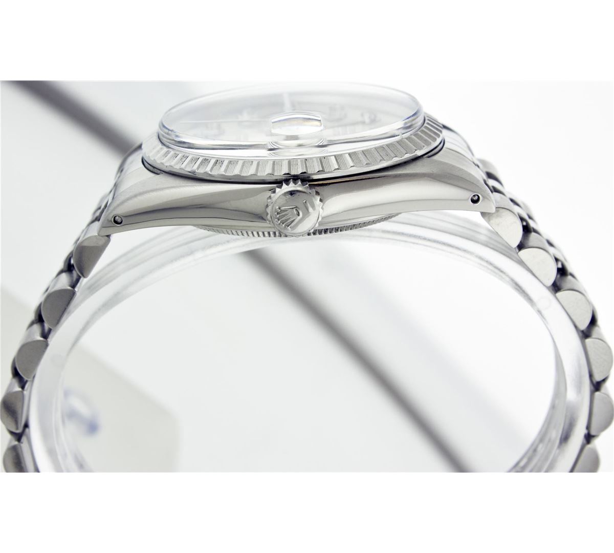 One Gents Rolex Datejust Polished Bright with Satin Finish, Serviced & Electronically Tested, Stainless Steel Case:36mm, Stainless Steel Crown, Original Bezel: 14K White Gold Fluted Bezel. Custom Crystal: Acrylic Cyclops Lens. Movement: Automatic Winding Movement Caliber 3035. Custom Dial: Silver Dial With Diamond Hour Markers, 10 Diamond in Dial G To H In Color, Si-VS Clarity. Date Window: 3 O'Clock Position Date Display, Quickset, Model: 16014 Condition: G-6 Extra Fine. Bracelet: Stainless Steel Jubilee. Bright Polish & Satin Finish. 6.5 Inch Length, Adjustable. Standard Clasp, With Rolex Logo.