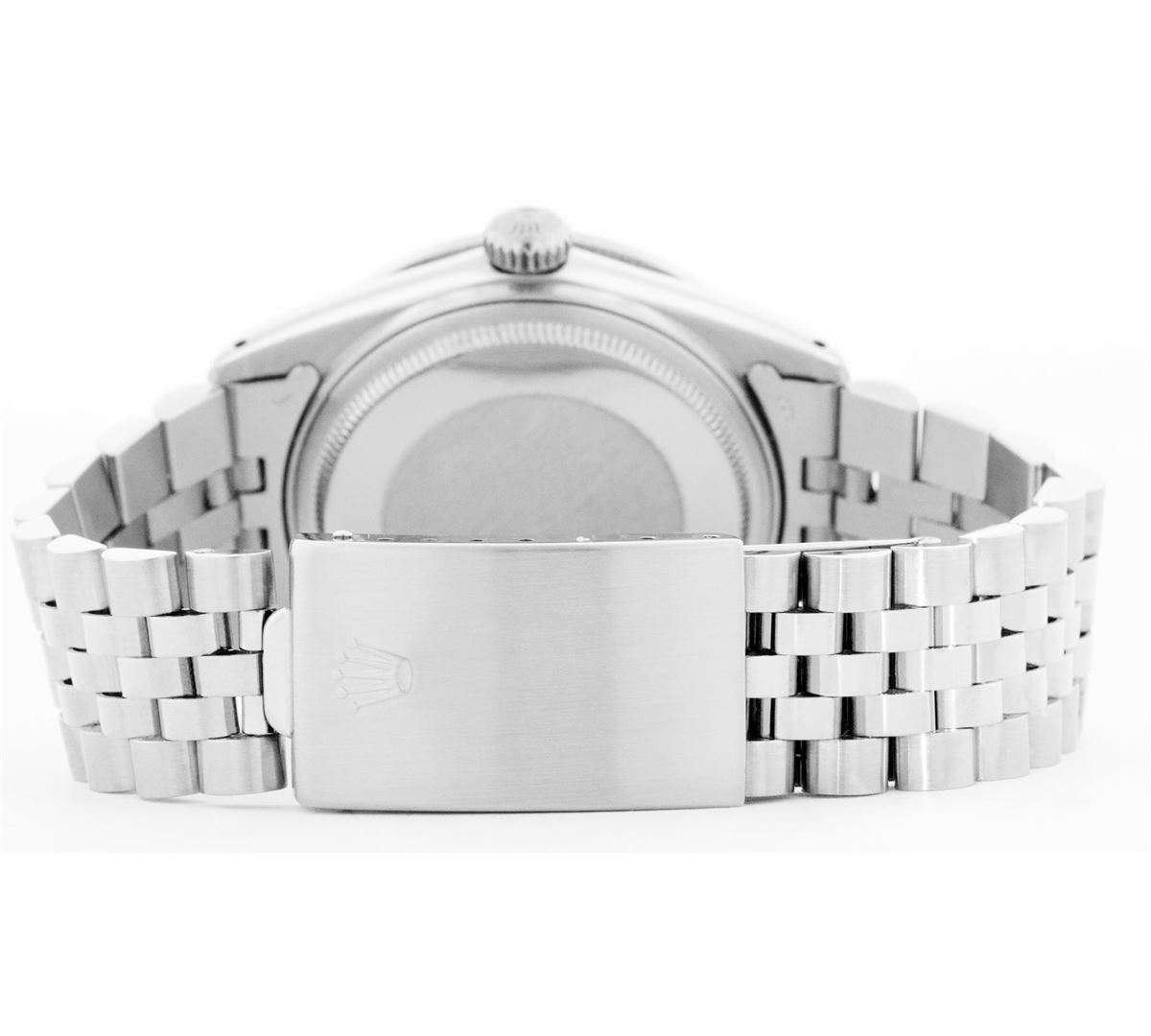 One Gents Rolex Datejust Polished Bright with Satin Finish, Serviced & Electronically Tested, Stainless Steel Case:36mm, Stainless Steel Crown, Original Bezel: 14K White Gold Fluted Bezel. Custom Crystal: Acrylic Cyclops Lens. Movement: Automatic Winding Movement Caliber 3035. Custom Dial: Mother Of Pearl Dial With String Diamond Hour Markers, 58 Diamonds in Dial G To H In Color, Si-VS Clarity. Date Window: 3 O'Clock Position Date Display, Quickset, Model: 16014 Condition: G-6 Extra Fine. Bracelet: Stainless Steel Jubilee. Bright Polish & Satin Finish. 6.5 Inch Length, Adjustable. Standard Clasp, With Rolex Logo.