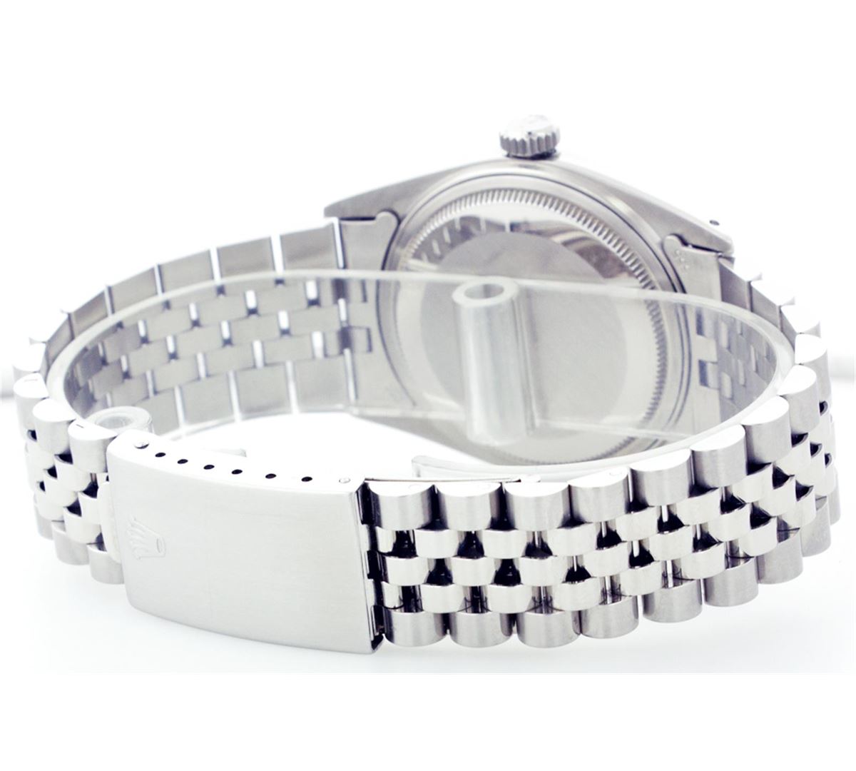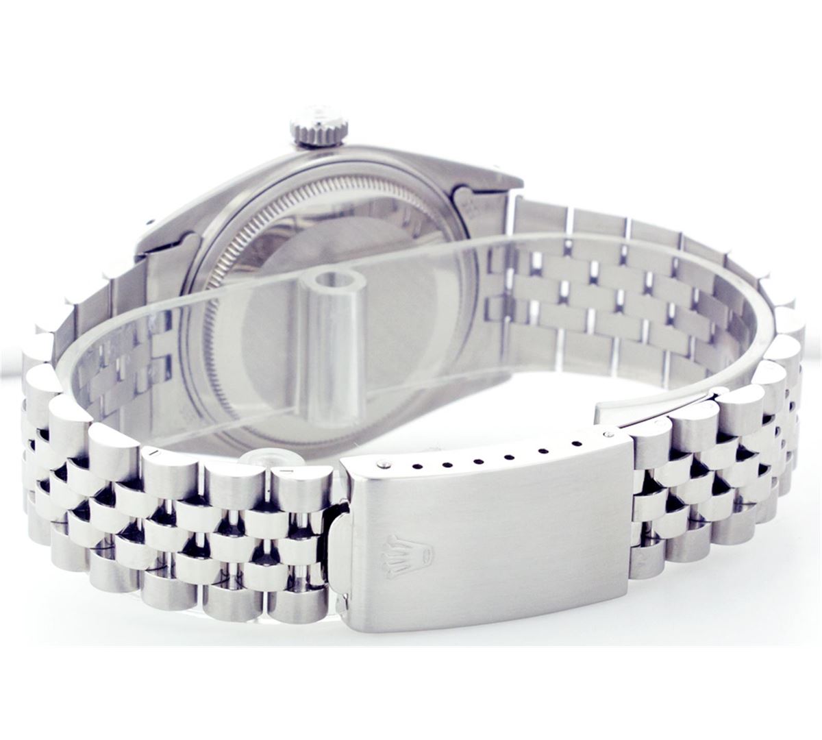 One Gents Rolex Datejust Polished Bright with Satin Finish, Serviced & Electronically Tested, Stainless Steel Case: 36mm, Stainless Steel Crown, Original Bezel: 14K White Gold Fluted Bezel. Custom Crystal: Acrylic Cyclops Lens. Movement: Automatic Winding Movement Caliber 3035. Custom Dial: Blue Index Dial. Date Window: 3 O'Clock Position Date Display, Quickset, Model: 16014 Condition: G-6 Extra Fine. Bracelet: Stainless Steel Jubilee. Bright Polish & Satin Finish. 6.5 Inch Length, Adjustable. Standard Clasp, With Rolex Logo.