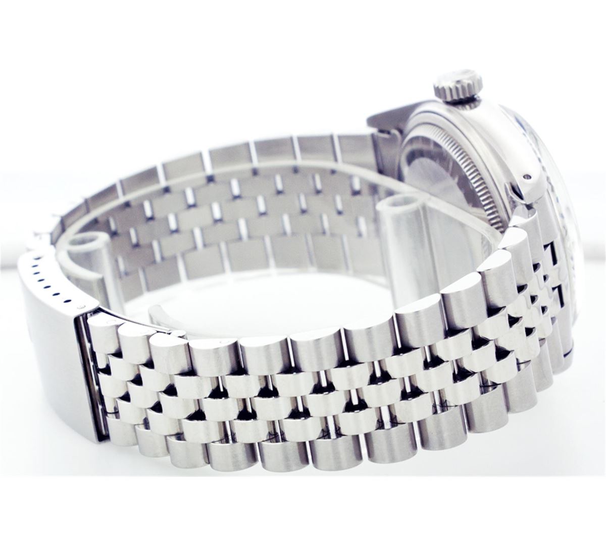 One Gents Rolex Datejust Polished Bright with Satin Finish, Serviced & Electronically Tested, Stainless Steel Case: 36mm, Stainless Steel Crown, Original Bezel: 14K White Gold Fluted Bezel. Custom Crystal: Acrylic Cyclops Lens. Movement: Automatic Winding Movement Caliber 3035. Custom Dial: Blue Index Dial. Date Window: 3 O'Clock Position Date Display, Quickset, Model: 16014 Condition: G-6 Extra Fine. Bracelet: Stainless Steel Jubilee. Bright Polish & Satin Finish. 6.5 Inch Length, Adjustable. Standard Clasp, With Rolex Logo.