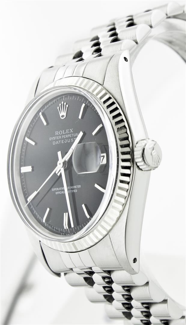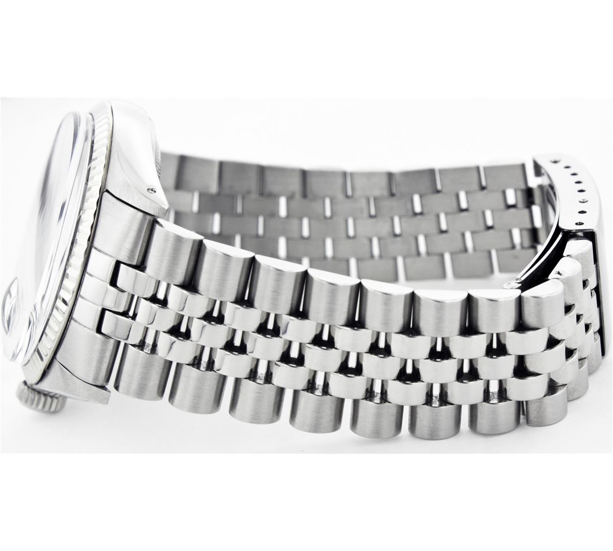 One Gents Rolex Datejust Polished, Serviced & Electronically Tested, Stainless Steel Case:36mm, Stainless Steel Crown, Bezel: 18K White Gold Fluted Bezel. Custom Crystal: Acrylic Cyclops Lens. Movement: Automatic Winding Movement Caliber 3035. Custom Dial: Black Dial With Index Hour Markers. Date Window: 3 O'Clock Position Date Display, Quickset, Model: 16014 Condition: G-6 Extra Fine. Bracelet: Stainless Steel Jubilee. Bright Polish & Satin Finish. 6.5 Inch Length, Adjustable. Standard Clasp, With Rolex Logo.