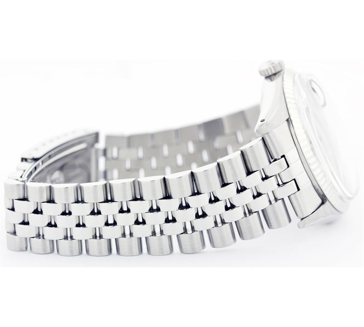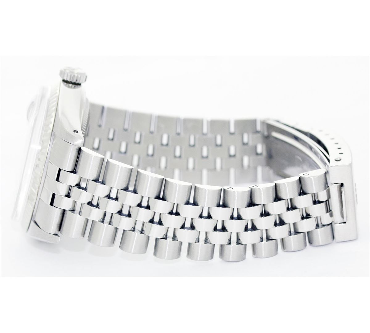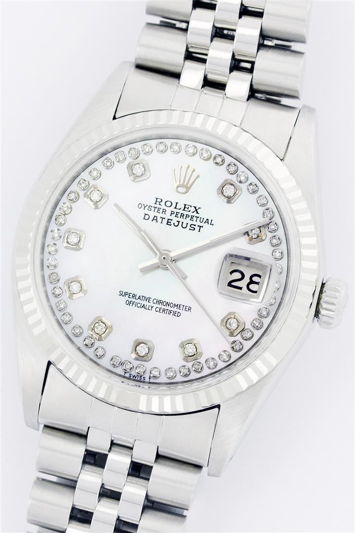 One Gents Rolex Datejust Polished Bright with Satin Finish, Serviced & Electronically Tested, Stainless Steel Case:36mm, Stainless Steel Crown, Original Bezel: 14K White Gold Fluted Bezel. Custom Crystal: Acrylic Cyclops Lens. Movement: Automatic Winding Movement Caliber 3035. Custom Dial: Mother Of Pearl Dial With String Diamond Hour Markers, 58 Diamonds in Dial G To H In Color, Si-VS Clarity. Date Window: 3 O'Clock Position Date Display, Quickset, Model: 16014 Condition: G-6 Extra Fine. Bracelet: Stainless Steel Jubilee. Bright Polish & Satin Finish. 6.5 Inch Length, Adjustable. Standard Clasp, With Rolex Logo.