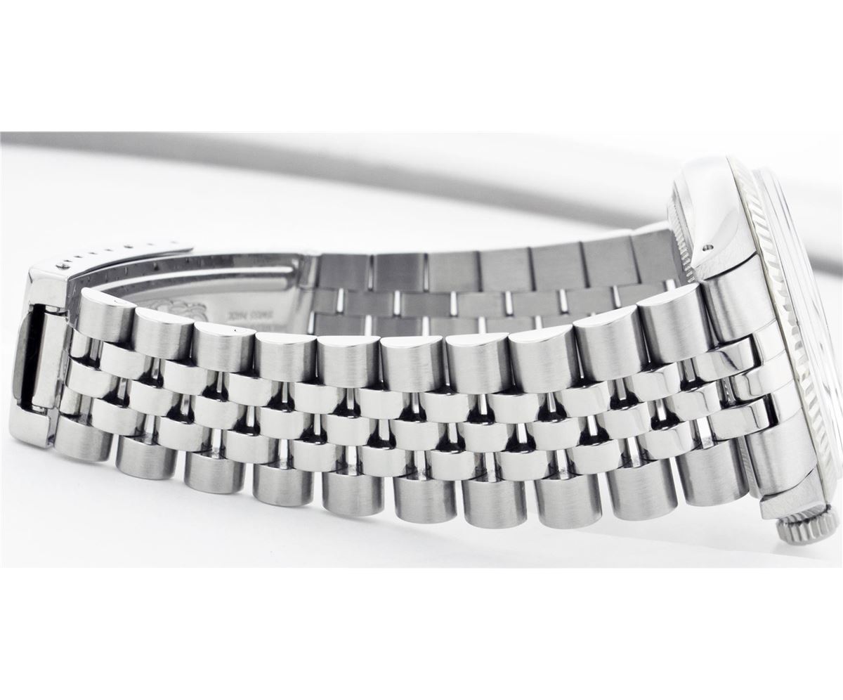 One Gents Rolex Datejust Polished, Serviced & Electronically Tested, Stainless Steel Case:36mm, Stainless Steel Crown, Bezel: 18K White Gold Fluted Bezel. Custom Crystal: Acrylic Cyclops Lens. Movement: Automatic Winding Movement Caliber 3035. Custom Dial: Black Dial With Index Hour Markers. Date Window: 3 O'Clock Position Date Display, Quickset, Model: 16014 Condition: G-6 Extra Fine. Bracelet: Stainless Steel Jubilee. Bright Polish & Satin Finish. 6.5 Inch Length, Adjustable. Standard Clasp, With Rolex Logo.